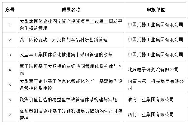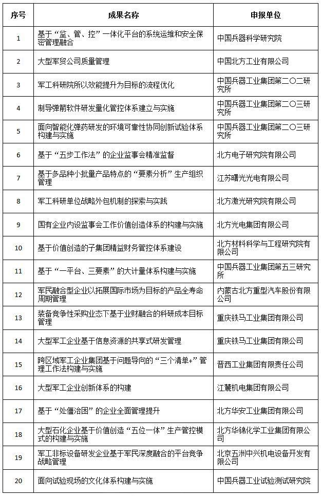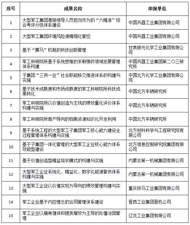 | 近日,中國(guo)兵器工(gong)業(ye)集團4項(xiang)創新成(cheng)(cheng)果(guo)獲全國(guo)企業(ye)管理現代化(hua)創新成(cheng)(cheng)果(guo)獎(jiang)、42項(xiang)創新成(cheng)(cheng)果(guo)獲國(guo)防科技(ji)工(gong)業(ye)企業(ye)管理創新成(cheng)(cheng)果(guo)獎(jiang)。 全國企業管理現代化創新成果 經全國(guo)企業(ye)(ye)(ye)管理(li)(li)現代化(hua)創新(xin)(xin)成果審定委員會(hui)終(zhong)審,第(di)二十五(wu)屆全國(guo)企業(ye)(ye)(ye)管理(li)(li)現代化(hua)創新(xin)(xin)成果公(gong)布,中(zhong)國(guo)兵器工業(ye)(ye)(ye)集團4項創新(xin)(xin)成果榮獲二等獎(jiang)。 二等獎 國防科技工業企業管理創新成果 2018年度國(guo)防科技工業(ye)(ye)企業(ye)(ye)管理創新(xin)獲獎(jiang)成果(guo)名單發布(bu),中國(guo)兵器工業(ye)(ye)集團共獲獎(jiang)42項,其(qi)中:一等(deng)獎(jiang)7項,二等(deng)獎(jiang)15項,三等(deng)獎(jiang)20項。獲獎(jiang)總量及一等(deng)獎(jiang)數量均位(wei)于(yu)軍工集團首(shou)位(wei)。 一等獎 二等獎 三等獎 據悉,2018年(nian)度(du)的(de)(de)國防科技工業(ye)企業(ye)管理創新評(ping)審(shen)工作(zuo),經專(zhuan)家(jia)初審(shen)、函(han)審(shen)、一等(deng)獎(jiang)候選成(cheng)(cheng)果(guo)答辯、專(zhuan)家(jia)會(hui)議(yi)評(ping)審(shen)、評(ping)審(shen)委員會(hui)審(shen)核并公示(shi)后,評(ping)選出一批在履行(xing)強軍首責、全面(mian)貫徹(che)創新驅動發(fa)展(zhan)戰略(lve)和全面(mian)深化改革、高質量發(fa)展(zhan)等(deng)方面(mian)的(de)(de)優秀(xiu)成(cheng)(cheng)果(guo)。本年(nian)度(du)共(gong)確定獲獎(jiang)成(cheng)(cheng)果(guo)307項,其中一等(deng)獎(jiang)44項,二(er)等(deng)獎(jiang)126項,三等(deng)獎(jiang)137項。 | ||