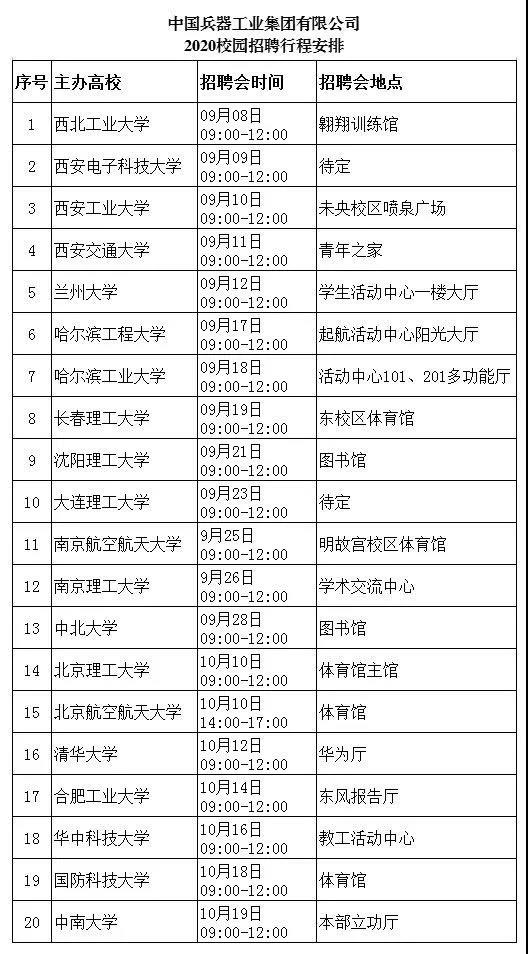 中國兵器工業集團 2020校園招聘火熱來襲 只等你來哦 有夢想的青年,請往下面看 讓我們攜手強軍報國 公司簡介 我們是我軍機械化(hua)、信息化(hua)、智能化(hua)裝備發展的骨干 我們是全(quan)軍毀傷打擊(ji)的核心支撐(cheng) 我(wo)們是現(xian)代化新(xin)型陸軍體系作戰能力(li)科研制(zhi)造的主(zhu)體 我(wo)們(men)是國家“一(yi)帶一(yi)路”建設和軍民融合發展的主(zhu)力 我們就是 中(zhong)國兵器工業集團(tuan) 我們闊步邁(mai)進世(shi)界一流防務集團 資產總額3960億(yi)元 世界(jie)500強(qiang)企業排名140 中國制造(zao)業企業排名第9 連續15年獲國資委(wei)經營業績考核(he)A級(ji) 招聘信息 面對2020年離開校園的你們,我們準備(bei)了 >>職位(wei):1500余個 >>招聘人數:3774人 >>專業涉及: 武器類 武器系統與發射工程,彈藥工程與爆(bao)炸技(ji)術,探測(ce)制(zhi)導與控制(zhi)技(ji)術等 機械類 機械設計制造及其自動(dong)化,車輛工(gong)程(cheng),工(gong)程(cheng)力學,機械電(dian)子(zi)工(gong)程(cheng)等(deng) 電子類 電氣(qi)工程及其(qi)自動化,電子信(xin)息工程,通信(xin)工程,儀(yi)器儀(yi)表工程等 材料類 金屬材(cai)(cai)料(liao)工程,材(cai)(cai)料(liao)成型及控制工程,高分子材(cai)(cai)料(liao)與(yu)工程,材(cai)(cai)料(liao)科學與(yu)工程等(deng) 計算機類 計算(suan)機(ji)(ji)科(ke)學與技術,計算(suan)機(ji)(ji)系(xi)統結構(gou),計算(suan)機(ji)(ji)軟件與理論(lun),網絡工程等 經管類 財(cai)務管(guan)(guan)理,工商管(guan)(guan)理,行政(zheng)管(guan)(guan)理,人力(li)資源(yuan)管(guan)(guan)理,會(hui)計學,審計學等 其他 環境與(yu)安全類(lei)(lei),臨床(chuang)醫(yi)學(xue),語言類(lei)(lei),建(jian)筑學(xue),法學(xue),采礦工程,化學(xue)類(lei)(lei)等 行程安排 中(zhong)國(guo)兵器工業集團2020屆(jie)校園招聘(pin)會將(jiang)在(zai)全國(guo)12個城市(shi)、20所高校舉辦,招聘(pin)會具(ju)體行程見下表: