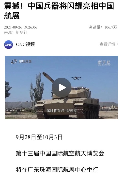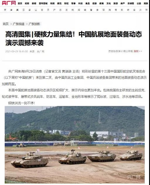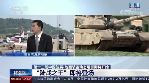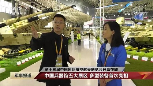 央視《新(xin)聞聯播(bo)》報道第十三屆中國(guo)航(hang)展(zhan)(zhan),著重介紹了VT4主戰坦克,關注(zhu)航(hang)展(zhan)(zhan)公(gong)眾(zhong)日中國(guo)兵器(qi)館情況。9月28日下午(wu)央視《新(xin)聞直(zhi)播(bo)間(jian)》航(hang)展(zhan)(zhan)特別(bie)節(jie)目《藍天(tian)盛會》邀請集(ji)團(tuan)公(gong)司訪談嘉(jia)賓(bin)做客直(zhi)播(bo)間(jian)對(dui)中國(guo)兵器(qi)館兵器(qi)工業集(ji)團(tuan)展(zhan)(zhan)區等進(jin)(jin)行(xing)1小時(shi)直(zhi)播(bo);9月28日下午(wu)、10月2日下午(wu)分別(bie)對(dui)地(di)面裝備(bei)動(dong)態表(biao)演進(jin)(jin)行(xing)兩場直(zhi)播(bo)。央視《朝聞天(tian)下》、《新(xin)聞直(zhi)播(bo)間(jian)》、《共同(tong)關注(zhu)》、《天(tian)下財(cai)經(jing)》、《軍事報道》、《正午(wu)國(guo)防軍事》、《軍武零距離》等相(xiang)繼推(tui)出集(ji)團(tuan)公(gong)司參展(zhan)(zhan)裝備(bei)的報道。