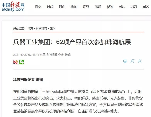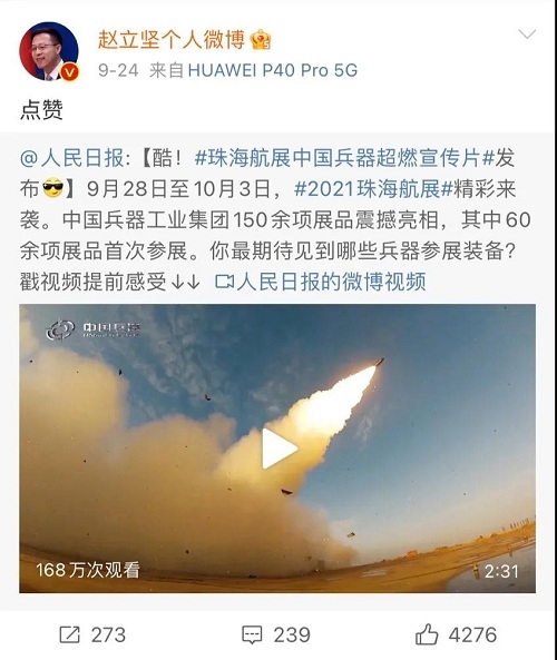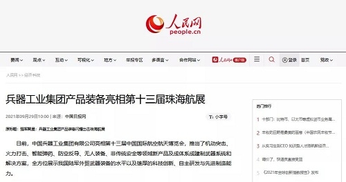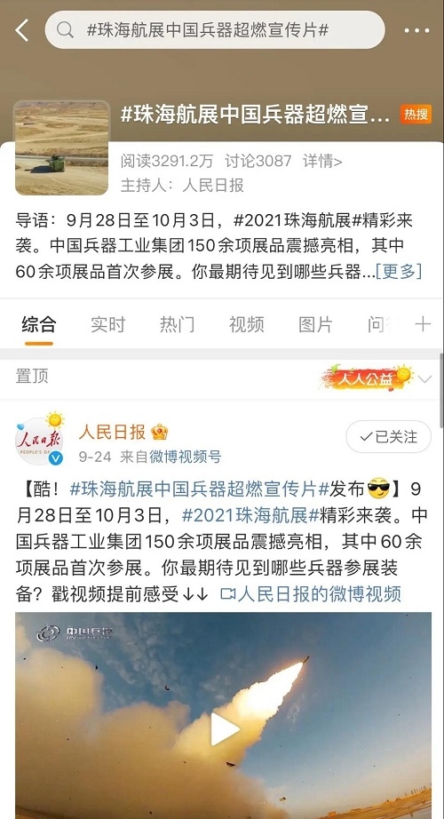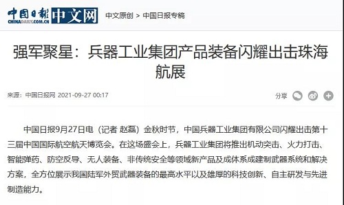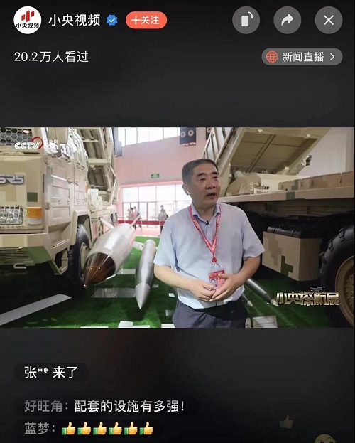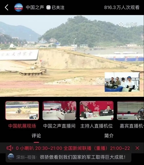 人民日報(bao)、新(xin)(xin)(xin)華社(she)、中(zhong)(zhong)國(guo)日報(bao)、共(gong)青(qing)團(tuan)中(zhong)(zhong)央、國(guo)資小新(xin)(xin)(xin)、騰訊軍(jun)事(shi)、鳳凰軍(jun)事(shi)、新(xin)(xin)(xin)浪軍(jun)事(shi)等(deng)新(xin)(xin)(xin)媒(mei)(mei)體發布的(de)集團(tuan)公(gong)司航展(zhan)宣傳片(pian)等(deng)視(shi)(shi)頻(pin)作品燃(ran)爆全網(wang),閱讀量(liang)突(tu)破三千萬人次,得到外(wai)交部發言人趙立堅轉載點(dian)贊。集團(tuan)公(gong)司微(wei)(wei)信(xin)、微(wei)(wei)博、抖音號、微(wei)(wei)信(xin)視(shi)(shi)頻(pin)號等(deng)新(xin)(xin)(xin)媒(mei)(mei)體宣傳片(pian)播(bo)放(fang)(fang)閱讀量(liang)超(chao)過400萬人次。同時,央視(shi)(shi)新(xin)(xin)(xin)聞、新(xin)(xin)(xin)華社(she)、中(zhong)(zhong)國(guo)之(zhi)聲(sheng)、央視(shi)(shi)軍(jun)事(shi)、央視(shi)(shi)新(xin)(xin)(xin)媒(mei)(mei)體、解放(fang)(fang)軍(jun)報(bao)、共(gong)青(qing)團(tuan)中(zhong)(zhong)央、國(guo)資小新(xin)(xin)(xin)、環球時報(bao)等(deng)多家(jia)媒(mei)(mei)體對集團(tuan)公(gong)司靜(jing)、動態展(zhan)區進行現(xian)場直(zhi)播(bo),在電視(shi)(shi)端、客戶端、微(wei)(wei)信(xin)視(shi)(shi)頻(pin)號、微(wei)(wei)博、B站、快手、抖音等(deng)平臺受到高(gao)度關注。著名軍(jun)事(shi)專家(jia)杜文龍、央視(shi)(shi)主持人顧國(guo)寧、央廣中(zhong)(zhong)國(guo)之(zhi)聲(sheng)主持人王藝等(deng)直(zhi)播(bo)兵器館、動態表演區裝備(bei)。