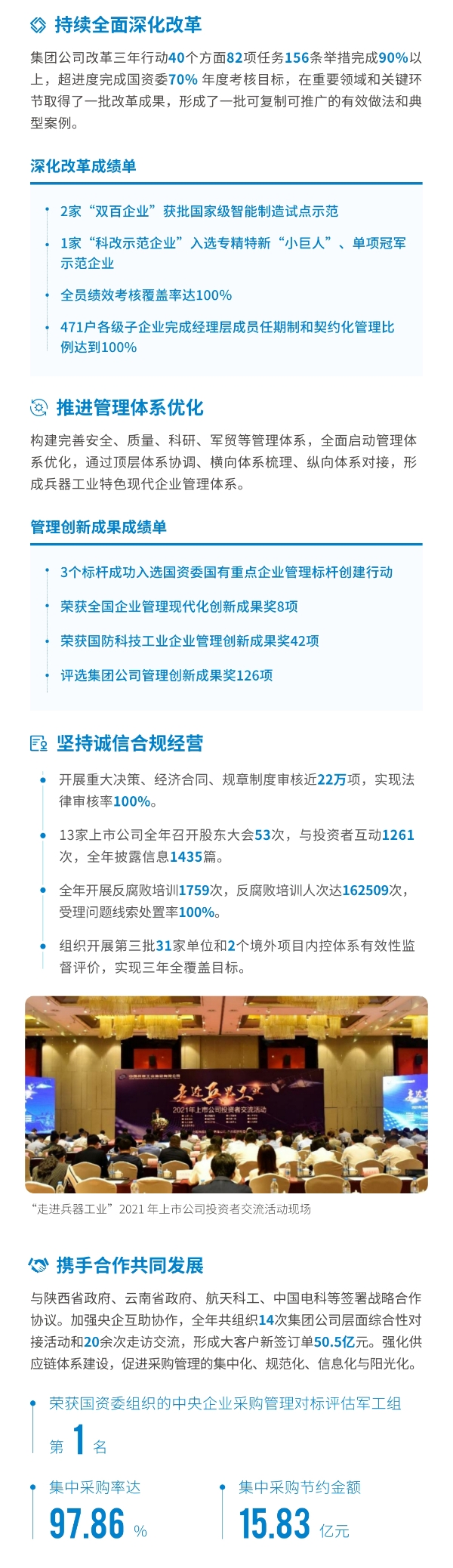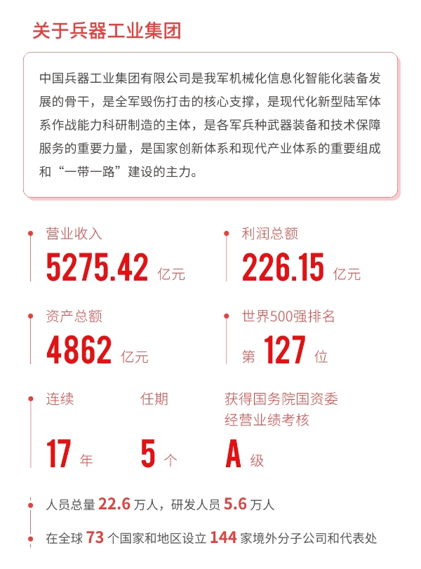 近日,兵器工業集(ji)團正式發布第(di)十三份(fen)年(nian)度社(she)會(hui)(hui)責(ze)任報(bao)(bao)告(gao)(gao)(gao)——《中(zhong)國(guo)兵器工業集(ji)團有限公司2021年(nian)社(she)會(hui)(hui)責(ze)任報(bao)(bao)告(gao)(gao)(gao)》,以“用心守護(hu)和(he)平、用力爭創(chuang)(chuang)一(yi)流、用情(qing)溫暖(nuan)社(she)會(hui)(hui)”為主題,從恪守強軍首責(ze)、服務經濟建設、共創(chuang)(chuang)美好(hao)生活三個維度,向社(she)會(hui)(hui)全面(mian)披露2021年(nian)度履責(ze)實(shi)踐和(he)履責(ze)業績。《報(bao)(bao)告(gao)(gao)(gao)》連續第(di)三年(nian)獲得(de)中(zhong)國(guo)企(qi)業社(she)會(hui)(hui)責(ze)任報(bao)(bao)告(gao)(gao)(gao)評(ping)級專家委(wei)員會(hui)(hui)“五(wu)星佳(jia)”評(ping)級,兵器工業集(ji)團成(cheng)為軍工行業唯一(yi)連續11年(nian)獲得(de)五(wu)星及五(wu)星佳(jia)最高評(ping)級的企(qi)業。 一圖解碼兵器工業的“責任力量”