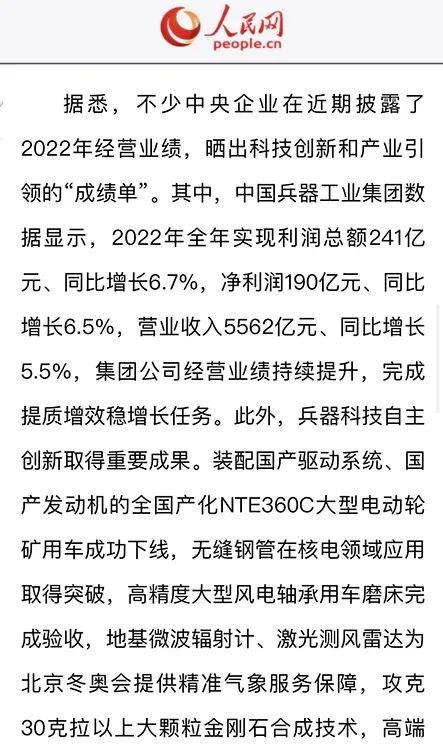 1月13日,中國兵器(qi)工業(ye)集團有限公司(si)(si)召開2023年(nian)度工作會議,傳達學(xue)習中央領導同志、軍(jun)方(fang)首長和(he)上級部(bu)門重要(yao)批示,總(zong)結(jie)集團公司(si)(si)2022年(nian)工作,研究(jiu)部(bu)署2023年(nian)主要(yao)工作任務。 集(ji)(ji)(ji)團(tuan)公司(si)(si)(si)2022年重(zhong)點(dian)(dian)工作取(qu)(qu)得的(de)成(cheng)績及下一步(bu)的(de)改(gai)革發展受(shou)到社會(hui)媒體廣泛(fan)關注(zhu)。新(xin)(xin)(xin)(xin)華社、新(xin)(xin)(xin)(xin)華財經(jing)、人民網(wang)(wang)、經(jing)濟日(ri)(ri)(ri)報(bao)(bao)客戶(hu)端(duan)、光明日(ri)(ri)(ri)報(bao)(bao)客戶(hu)端(duan)、中國日(ri)(ri)(ri)報(bao)(bao)網(wang)(wang)、中國科技網(wang)(wang)、中國新(xin)(xin)(xin)(xin)聞網(wang)(wang)、央廣網(wang)(wang)、國資委網(wang)(wang)站(zhan)、學習(xi)強國中央企(qi)業學習(xi)平(ping)臺(tai)、新(xin)(xin)(xin)(xin)浪網(wang)(wang)、騰(teng)訊網(wang)(wang)、搜狐網(wang)(wang)、網(wang)(wang)易網(wang)(wang)、今日(ri)(ri)(ri)頭(tou)條(tiao)等中央主(zhu)流媒體、國家部委網(wang)(wang)站(zhan)及知名網(wang)(wang)絡媒體對集(ji)(ji)(ji)團(tuan)公司(si)(si)(si)工作會(hui)議進(jin)行(xing)了(le)報(bao)(bao)道,重(zhong)點(dian)(dian)關注(zhu)集(ji)(ji)(ji)團(tuan)公司(si)(si)(si)高(gao)質(zhi)量發展、科技創新(xin)(xin)(xin)(xin)、戰(zhan)略(lve)性(xing)新(xin)(xin)(xin)(xin)興產業培(pei)育、深化(hua)改(gai)革、國際(ji)化(hua)經(jing)營、履行(xing)央企(qi)社會(hui)責任等內容。其中新(xin)(xin)(xin)(xin)華社以《北斗時空智能(neng)服務平(ping)臺(tai)累計服務終端(duan)數突破15億(yi)》為(wei)題,重(zhong)點(dian)(dian)報(bao)(bao)道了(le)集(ji)(ji)(ji)團(tuan)公司(si)(si)(si)2022年在(zai)自主(zhu)創新(xin)(xin)(xin)(xin)、戰(zhan)略(lve)新(xin)(xin)(xin)(xin)興產業培(pei)育、專利申請等方面(mian)取(qu)(qu)得的(de)成(cheng)績;經(jing)濟日(ri)(ri)(ri)報(bao)(bao)客戶(hu)端(duan)、光明日(ri)(ri)(ri)報(bao)(bao)客戶(hu)端(duan)、中國日(ri)(ri)(ri)報(bao)(bao)網(wang)(wang)等以《兵器工業集(ji)(ji)(ji)團(tuan)2022年經(jing)營業績持續(xu)提升(sheng)》為(wei)題,重(zhong)點(dian)(dian)報(bao)(bao)道了(le)集(ji)(ji)(ji)團(tuan)公司(si)(si)(si)在(zai)高(gao)質(zhi)量發展、全面(mian)完成(cheng)提質(zhi)增(zeng)效穩增(zeng)長方面(mian)取(qu)(qu)得的(de)成(cheng)績。集(ji)(ji)(ji)團(tuan)公司(si)(si)(si)門戶(hu)網(wang)(wang)站(zhan)、微信(xin)公眾號、微博等新(xin)(xin)(xin)(xin)媒體也對集(ji)(ji)(ji)團(tuan)公司(si)(si)(si)工作會(hui)議進(jin)行(xing)了(le)及時報(bao)(bao)道,各成(cheng)員單位紛紛對相關內容進(jin)行(xing)轉載,引發全系統關注(zhu)。 新華社:北斗時空智能服務平臺累計服務終端數突破15億 新華財經:兵器工業集團2022年實現凈利潤190億元 同比增長6.5% 人民網:2022年中央企業營收同比增長8.3% 科技創新成效顯著 經濟日報客戶端:兵器工業集團2022年經營業績持續提升 光明日報客戶端:兵器工業集團2022年經營業績持續提升 中國日報網:兵器工業集團2022年經營業績持續提升 中國科技網:兵器工業集團2022年實現利潤總額241億元 中國新聞網:2022年兵器工業集團實現利潤總額241億元 同比增長6.7% 國資委網站:2022年兵器工業集團實現利潤總額241億元 同比增長6.7% 學習強國中央企業學習平臺:兵器工業集團2022年經營業績持續提升 集團公司職工及廣大網友熱議工作會議 “這(zhe)次會議(yi)全(quan)面(mian)總結了2022年工(gong)作(zuo),深入分析研判當前形勢,部署(shu)2023年重(zhong)點工(gong)作(zuo),為我(wo)們做(zuo)好(hao)2023年及(ji)今后(hou)一個(ge)時(shi)期的(de)工(gong)作(zuo)明確(que)了目標、堅定了信心(xin)。” “作(zuo)為兵工人(ren),我要苦(ku)練內功、不懼挑戰、奮勇向前(qian),為建設具有全球競(jing)爭(zheng)力的(de)(de)世界(jie)一流集團公(gong)司(si)貢獻自己的(de)(de)力量。” “聚焦(jiao)高科技領域,制造更多的大國重器(qi),讓更多的產品服務老百姓。” “在(zai)不平凡的(de)2022年取得了(le)亮眼(yan)的(de)工作成績,為(wei)兵器工業點贊。” “希望能有更(geng)多新型(xing)武器(qi)裝備部隊,2023年,望你們再(zai)創輝煌(huang),加油!” |