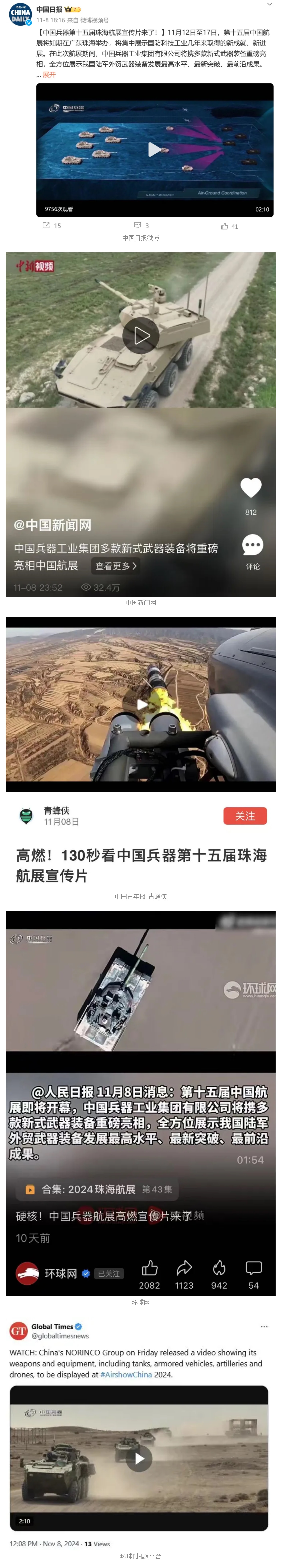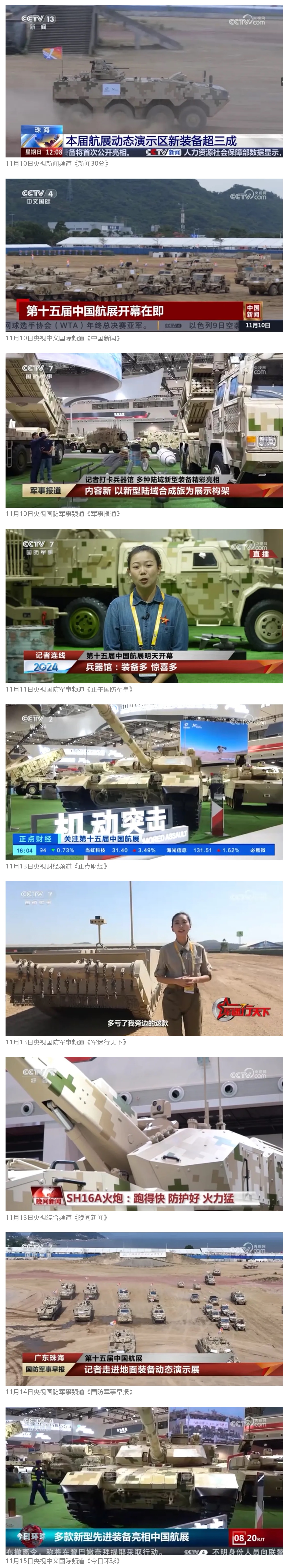 11月(yue)(yue)13日(ri)央(yang)(yang)(yang)視(shi)(shi)新(xin)(xin)聞(wen)(wen)(wen)《藍(lan)天(tian)(tian)之約》直播(bo)地面裝備(bei)動態演示此(ci)次(ci)航展,央(yang)(yang)(yang)視(shi)(shi)綜(zong)合(he)頻(pin)(pin)(pin)(pin)道(dao)(dao)《新(xin)(xin)聞(wen)(wen)(wen)聯播(bo)》《晚間(jian)(jian)新(xin)(xin)聞(wen)(wen)(wen)》、新(xin)(xin)聞(wen)(wen)(wen)頻(pin)(pin)(pin)(pin)道(dao)(dao)《新(xin)(xin)聞(wen)(wen)(wen)直播(bo)間(jian)(jian)》《新(xin)(xin)聞(wen)(wen)(wen)30分(fen)》《朝聞(wen)(wen)(wen)天(tian)(tian)下》《共同關注》《東方時(shi)空》《午(wu)夜(ye)新(xin)(xin)聞(wen)(wen)(wen)》、財經頻(pin)(pin)(pin)(pin)道(dao)(dao)《天(tian)(tian)下財經》《經濟信息聯播(bo)》《正(zheng)(zheng)(zheng)點財經》《第一時(shi)間(jian)(jian)》、中(zhong)文國(guo)(guo)(guo)際頻(pin)(pin)(pin)(pin)道(dao)(dao)《今日(ri)環(huan)球》《中(zhong)國(guo)(guo)(guo)新(xin)(xin)聞(wen)(wen)(wen)》、國(guo)(guo)(guo)防(fang)軍(jun)事(shi)頻(pin)(pin)(pin)(pin)道(dao)(dao)《軍(jun)事(shi)報(bao)(bao)道(dao)(dao)》《正(zheng)(zheng)(zheng)午(wu)國(guo)(guo)(guo)防(fang)軍(jun)事(shi)》《國(guo)(guo)(guo)防(fang)軍(jun)事(shi)早報(bao)(bao)》《軍(jun)迷行天(tian)(tian)下》等欄目共播(bo)出兵器(qi)工業集團參展相(xiang)關新(xin)(xin)聞(wen)(wen)(wen)報(bao)(bao)道(dao)(dao)40余條(tiao)。11月(yue)(yue)10日(ri)央(yang)(yang)(yang)視(shi)(shi)新(xin)(xin)聞(wen)(wen)(wen)頻(pin)(pin)(pin)(pin)道(dao)(dao)《新(xin)(xin)聞(wen)(wen)(wen)30分(fen)》11月(yue)(yue)10日(ri)央(yang)(yang)(yang)視(shi)(shi)中(zhong)文國(guo)(guo)(guo)際頻(pin)(pin)(pin)(pin)道(dao)(dao)《中(zhong)國(guo)(guo)(guo)新(xin)(xin)聞(wen)(wen)(wen)》11月(yue)(yue)10日(ri)央(yang)(yang)(yang)視(shi)(shi)國(guo)(guo)(guo)防(fang)軍(jun)事(shi)頻(pin)(pin)(pin)(pin)道(dao)(dao)《軍(jun)事(shi)報(bao)(bao)道(dao)(dao)》11月(yue)(yue)11日(ri)央(yang)(yang)(yang)視(shi)(shi)國(guo)(guo)(guo)防(fang)軍(jun)事(shi)頻(pin)(pin)(pin)(pin)道(dao)(dao)《正(zheng)(zheng)(zheng)午(wu)國(guo)(guo)(guo)防(fang)軍(jun)事(shi)》