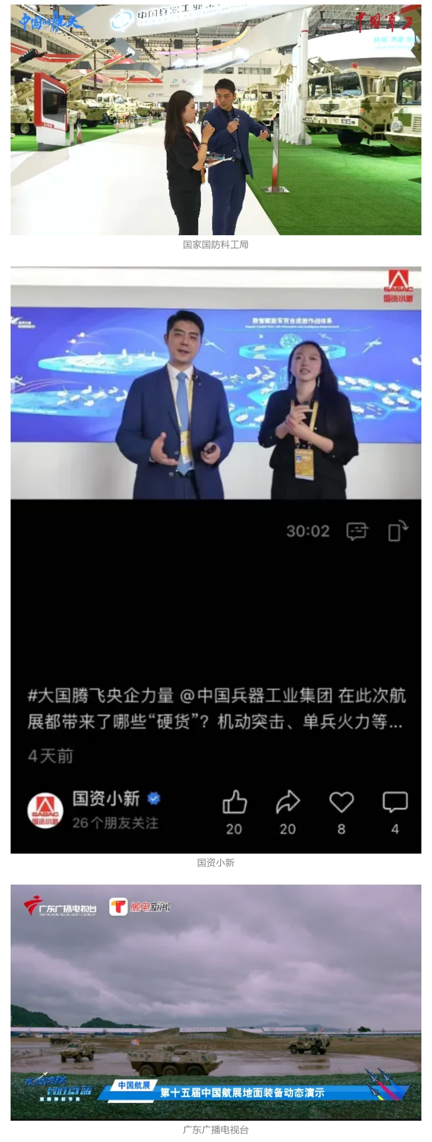 新(xin)華社(she)、央視(shi)新(xin)聞、中(zhong)央廣播電視(shi)總臺中(zhong)國(guo)之(zhi)聲、央視(shi)軍事、中(zhong)國(guo)軍視(shi)網、廣東(dong)廣播電視(shi)臺等(deng)媒(mei)體以及(ji)國(guo)家國(guo)防科工(gong)局、國(guo)資小新(xin)等(deng)到兵(bing)器工(gong)業集團地面動態演示區、中(zhong)國(guo)兵(bing)器館進行了(le)直(zhi)播。