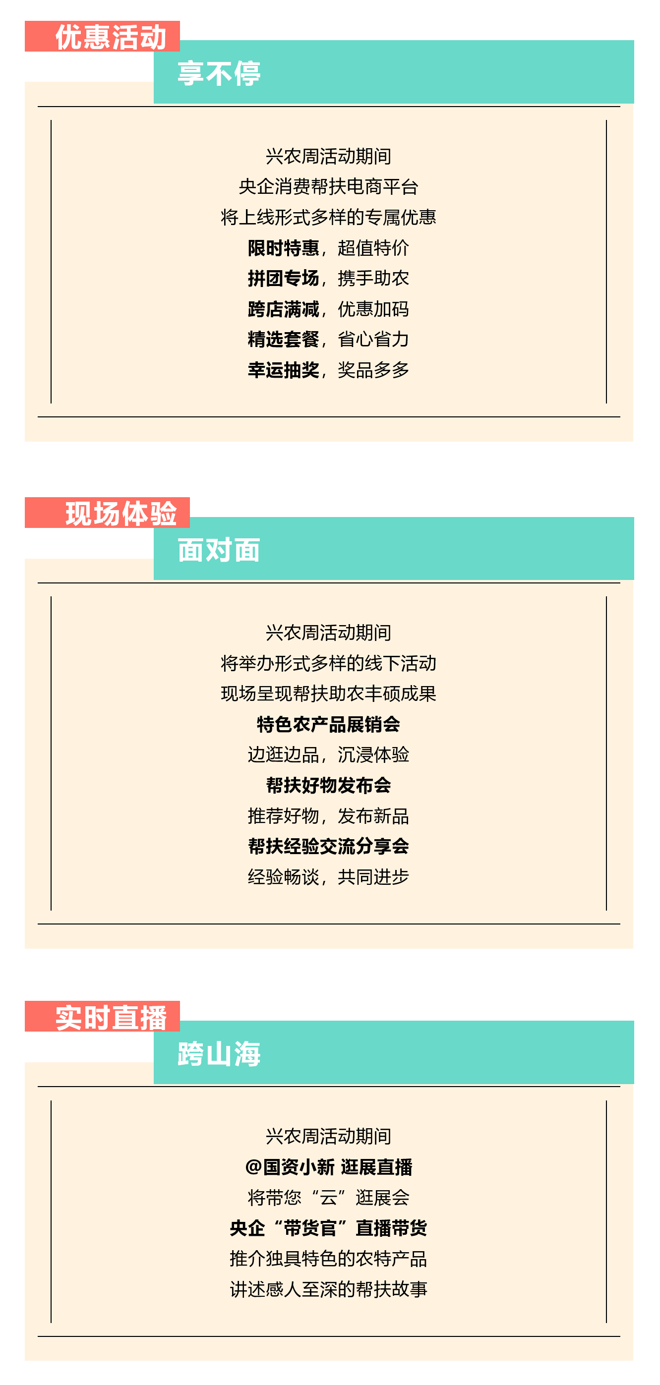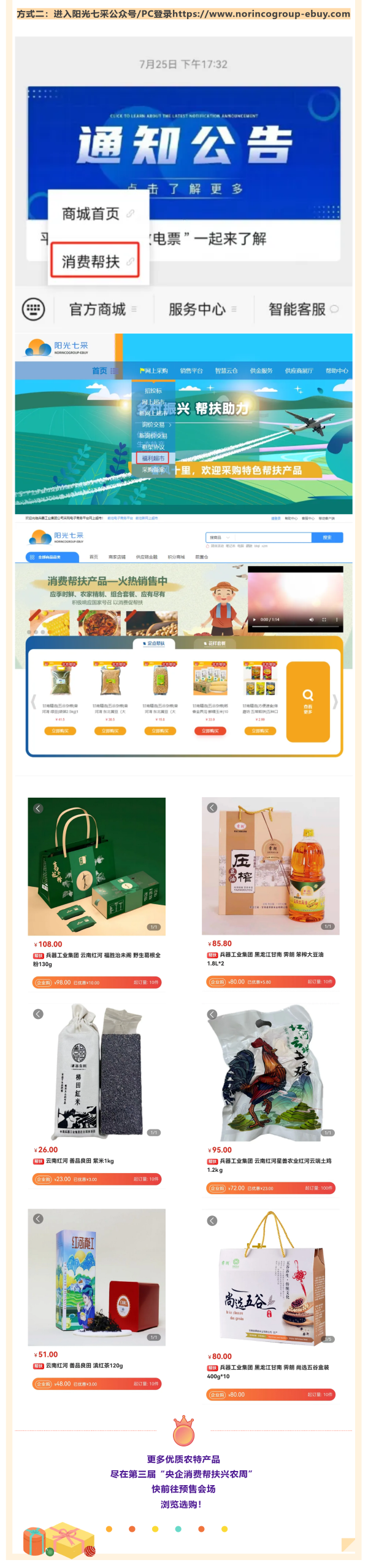 百家央企聚合力 消費幫扶促振興 第三屆“央企消費幫扶興農周” 預售已啟動 8月30日 興農周活動將正式開啟 “央企消費幫扶興農周”由國(guo)(guo)(guo)務院國(guo)(guo)(guo)資(zi)委(wei)社會責(ze)任局指導,央(yang)企消(xiao)費幫扶電商(shang)(shang)平(ping)臺(國(guo)(guo)(guo)網數字科(ke)技控(kong)股(gu)有限公(gong)司)主(zhu)辦,國(guo)(guo)(guo)務院國(guo)(guo)(guo)資(zi)委(wei)機關服務管理(li)局、國(guo)(guo)(guo)務院國(guo)(guo)(guo)資(zi)委(wei)新聞中(zhong)心、國(guo)(guo)(guo)網北(bei)京市電力公(gong)司、各(ge)中(zhong)央(yang)企業(ye)電商(shang)(shang)平(ping)臺聯合(he)協辦。 活動以“央企攜手,興農惠民”為主題,組織動員中央企業所屬各單位各部門(特別是工會、食堂)、廣大干部職工、上下游供應商和業務合作伙伴采購幫扶縣的優質農產品,促進脫貧地區產業發展和脫貧群眾穩定增收,鞏固拓展脫貧攻堅成果。 預售活動火熱開啟 為方便大家提前選購 此次預售期升級為10天 (8月20日-8月29日) 誠邀下單 兵器工業集團定點幫扶 黑龍江甘南縣、云南紅河縣 農特產品! 8月30日-9月5日 請鎖定“央企館-兵器工業集團” 我們一起共譜鄉村振興新篇章! |