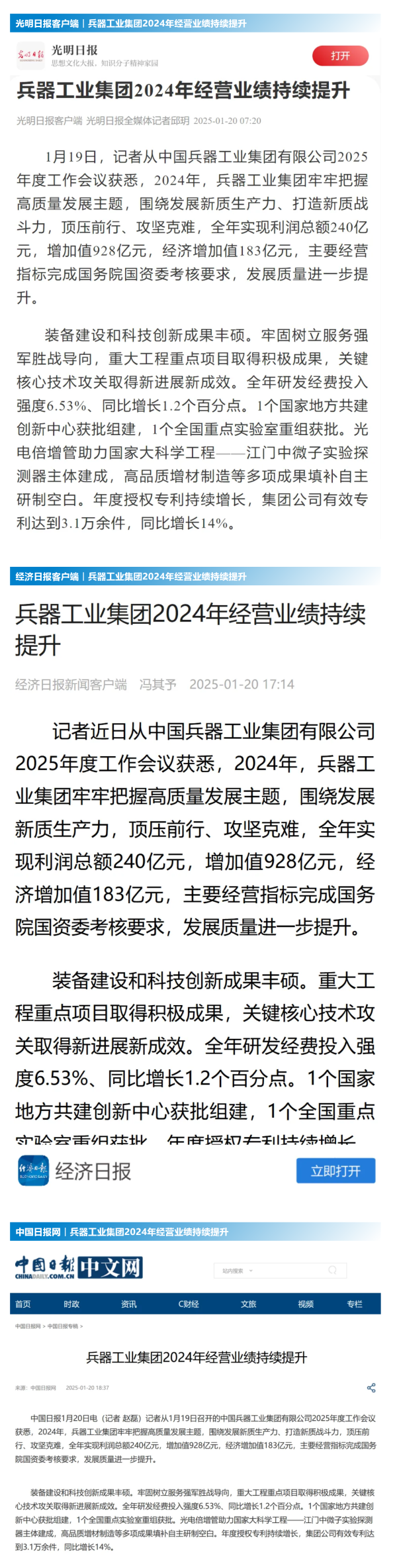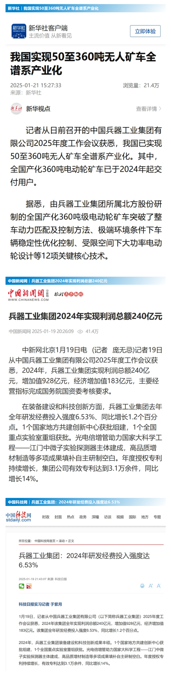 1月19日(ri)(ri)至(zhi)20日(ri)(ri),中(zhong)國兵器工業集團有限(xian)公司2025年度工作會(hui)議(yi)在京(jing)召開,會(hui)議(yi)總結2024年工作,分(fen)析形勢(shi)任務,明(ming)確工作思路,部署2025年工作。 集(ji)(ji)團(tuan)(tuan)公司(si)(si)2024年取得(de)的(de)成績及下一步重點(dian)(dian)工(gong)作受(shou)到社(she)會(hui)媒(mei)體廣泛關(guan)注。新(xin)(xin)華(hua)社(she)、中(zhong)國(guo)(guo)(guo)新(xin)(xin)聞(wen)(wen)網(wang)(wang)(wang)、中(zhong)國(guo)(guo)(guo)科技(ji)(ji)網(wang)(wang)(wang)、光明日(ri)報(bao)(bao)客戶端(duan)、經濟日(ri)報(bao)(bao)客戶端(duan)、中(zhong)國(guo)(guo)(guo)日(ri)報(bao)(bao)網(wang)(wang)(wang)、國(guo)(guo)(guo)務院國(guo)(guo)(guo)資委(wei)網(wang)(wang)(wang)站(zhan)、學(xue)習(xi)強(qiang)國(guo)(guo)(guo)中(zhong)央企業(ye)(ye)學(xue)習(xi)平臺、新(xin)(xin)浪網(wang)(wang)(wang)、網(wang)(wang)(wang)易(yi)網(wang)(wang)(wang)、搜(sou)狐網(wang)(wang)(wang)、騰訊網(wang)(wang)(wang)、鳳凰網(wang)(wang)(wang)等(deng)(deng)中(zhong)央主流媒(mei)體、國(guo)(guo)(guo)家部(bu)委(wei)網(wang)(wang)(wang)站(zhan)及知(zhi)名網(wang)(wang)(wang)絡媒(mei)體對(dui)(dui)集(ji)(ji)團(tuan)(tuan)公司(si)(si)2025年度工(gong)作會(hui)議(yi)進(jin)行(xing)(xing)了(le)(le)報(bao)(bao)道,重點(dian)(dian)關(guan)注集(ji)(ji)團(tuan)(tuan)公司(si)(si)經營業(ye)(ye)績、科技(ji)(ji)創新(xin)(xin)、產(chan)業(ye)(ye)結構布局優化等(deng)(deng)情況。其(qi)中(zhong),新(xin)(xin)華(hua)社(she)以《我國(guo)(guo)(guo)實現50至360噸無人礦車全譜系產(chan)業(ye)(ye)化》為題,重點(dian)(dian)報(bao)(bao)道了(le)(le)集(ji)(ji)團(tuan)(tuan)公司(si)(si)在推動(dong)智能制(zhi)造水(shui)平提升方面取得(de)的(de)成效;中(zhong)國(guo)(guo)(guo)新(xin)(xin)聞(wen)(wen)網(wang)(wang)(wang)、光明日(ri)報(bao)(bao)客戶端(duan)、經濟日(ri)報(bao)(bao)客戶端(duan)、中(zhong)國(guo)(guo)(guo)日(ri)報(bao)(bao)網(wang)(wang)(wang)等(deng)(deng)就(jiu)集(ji)(ji)團(tuan)(tuan)公司(si)(si)2024年度經營業(ye)(ye)績及各項工(gong)作取得(de)的(de)成果進(jin)行(xing)(xing)報(bao)(bao)道;中(zhong)國(guo)(guo)(guo)科技(ji)(ji)網(wang)(wang)(wang)著重報(bao)(bao)道了(le)(le)集(ji)(ji)團(tuan)(tuan)公司(si)(si)在科技(ji)(ji)創新(xin)(xin)和(he)優化產(chan)業(ye)(ye)結構布局方面的(de)最新(xin)(xin)進(jin)展。集(ji)(ji)團(tuan)(tuan)公司(si)(si)門戶網(wang)(wang)(wang)站(zhan)、微信公眾號、微博(bo)等(deng)(deng)新(xin)(xin)媒(mei)體平臺以及《中(zhong)國(guo)(guo)(guo)兵工(gong)報(bao)(bao)》也對(dui)(dui)集(ji)(ji)團(tuan)(tuan)公司(si)(si)工(gong)作會(hui)議(yi)進(jin)行(xing)(xing)了(le)(le)及時報(bao)(bao)道,各成員單(dan)位紛紛對(dui)(dui)相關(guan)內容進(jin)行(xing)(xing)轉載,引(yin)發全系統關(guan)注。 集團公司職工及廣大網友熱議工作會 “2025年工作會為(wei)我們(men)指明了(le)發展方向(xiang)、明確(que)了(le)奮斗目標,面對(dui)全(quan)新(xin)的機遇和挑戰,作為(wei)兵工人深感責任重大(da)。” “科(ke)技是第(di)一(yi)生產力(li),一(yi)定要以科(ke)技創新引領新質(zhi)生產力(li)發展(zhan)(zhan),為高質(zhi)量(liang)發展(zhan)(zhan)提(ti)供支撐。” “把各項工作做深、做實、做細,努力為集團公司高質量發(fa)展添(tian)磚(zhuan)加瓦。” “2024年中國(guo)兵(bing)器展(zhan)示了(le)大國(guo)重(zhong)器,祝新的一年中再創輝煌(huang)!” |