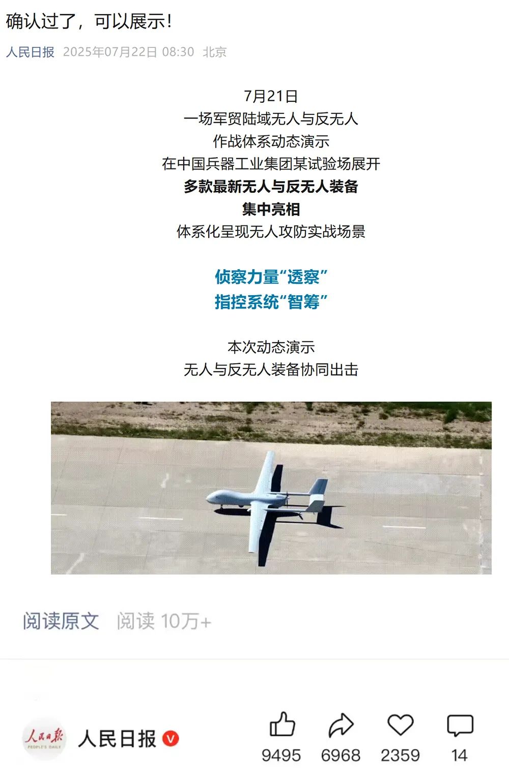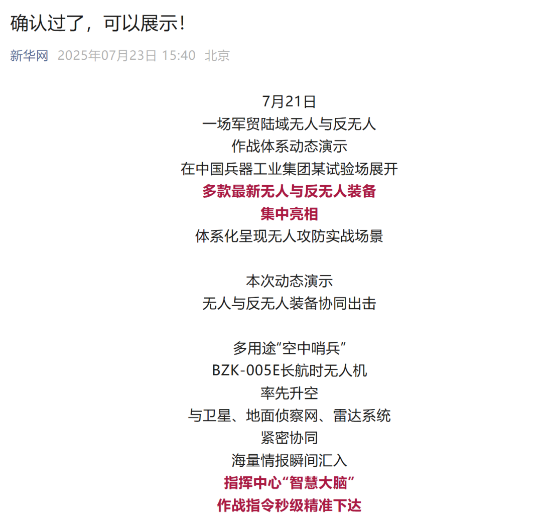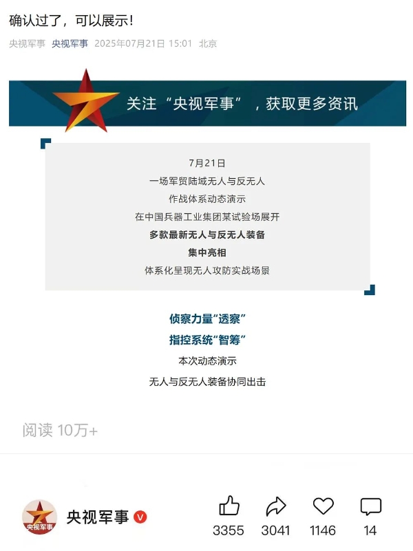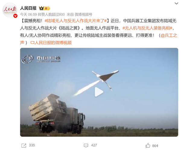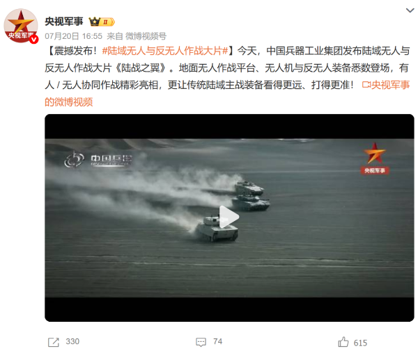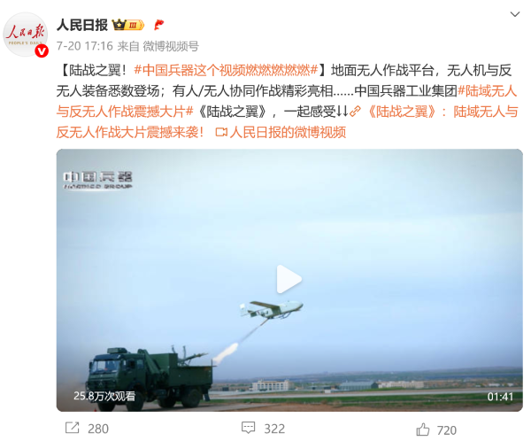7月21日,中(zhong)國兵器(qi)工業集團(tuan)有(you)限公(gong)司在(zai)位于內蒙古的某試(shi)驗場(chang)舉辦(ban)軍(jun)貿陸域(yu)無(wu)(wu)人(ren)與(yu)反無(wu)(wu)人(ren)作戰體(ti)系主題日活動,攜無(wu)(wu)人(ren)機、巡飛彈、反無(wu)(wu)人(ren)機等(deng)最新武器(qi)裝備登場(chang)亮(liang)相,展現了一場(chang)無(wu)(wu)人(ren)與(yu)反無(wu)(wu)人(ren)領域(yu)激烈(lie)對抗(kang)的實(shi)戰場(chang)景。中(zhong)央主流媒(mei)體(ti)、地方媒(mei)體(ti)、知名網絡(luo)媒(mei)體(ti),以及集團(tuan)公(gong)司各宣傳平臺(tai)紛(fen)紛(fen)進行報道,多次(ci)登上熱搜,引發廣泛(fan)關注。 央(yang)視新聞(wen)頻道(dao)(dao)《新聞(wen)直播間(jian)》《東方(fang)時空》《24小時》、國(guo)(guo)防軍事(shi)頻道(dao)(dao)《正午國(guo)(guo)防軍事(shi)》《軍事(shi)報(bao)(bao)道(dao)(dao)》《國(guo)(guo)防軍事(shi)早報(bao)(bao)》、中文國(guo)(guo)際頻道(dao)(dao)《今日環球》、央(yang)視軍事(shi)新媒(mei)體等報(bao)(bao)道(dao)(dao)了集團公司軍貿陸域(yu)無(wu)人(ren)與(yu)反無(wu)人(ren)作戰(zhan)體系首次公開實裝(zhuang)(zhuang)動態演示有關情況,重點(dian)介紹了無(wu)人(ren)與(yu)反無(wu)人(ren)作戰(zhan)最新裝(zhuang)(zhuang)備。 央視新(xin)聞(wen)頻(pin)道《新(xin)聞(wen)直播(bo)間》:內蒙古 軍貿陸域無(wu)人與反無(wu)人作戰最新(xin)裝備亮相 央視新(xin)聞頻道《新(xin)聞直播間》:內蒙(meng)古(gu) 軍(jun)貿(mao)陸(lu)域無人與反無人作戰最新(xin)裝備(bei)亮相(xiang) 記者探訪(fang)無人裝備(bei)展區 央(yang)視新(xin)聞頻道《新(xin)聞直播間》:軍貿陸域無人(ren)(ren)與反無人(ren)(ren)作戰最新(xin)裝備亮(liang)相(xiang)·記(ji)者探訪 最強“盾牌” 反無人(ren)(ren)機系統新(xin)升級 人民日報(bao)微(wei)(wei)(wei)博(bo)、央視軍事微(wei)(wei)(wei)博(bo)、央視新(xin)(xin)聞客戶(hu)端、中國新(xin)(xin)聞網(wang)、中新(xin)(xin)社國是直通車抖音、環球(qiu)網(wang)微(wei)(wei)(wei)博(bo)、環球(qiu)時報(bao)(X平(ping)臺、英文(wen)版客戶(hu)端)、中國日報(bao)網(wang)、央視軍事報(bao)道微(wei)(wei)(wei)博(bo)、中國軍號(hao)微(wei)(wei)(wei)博(bo)、中央廣播電(dian)視總臺“空天逐夢(meng)”微(wei)(wei)(wei)信視頻號(hao)、共青團(tuan)中央B站、國資小新(xin)(xin)微(wei)(wei)(wei)博(bo)等(deng)中央主(zhu)流媒體、國家部委的新(xin)(xin)媒體播發集團(tuan)公司(si)陸(lu)域無(wu)人與反無(wu)人作戰大片等(deng)視頻作品(pin)。 人(ren)民(min)日報微博 央視軍事微博(bo) 人(ren)(ren)民(min)日報(bao)、新(xin)華(hua)網、央(yang)(yang)(yang)視(shi)軍事、央(yang)(yang)(yang)視(shi)新(xin)聞、中(zhong)(zhong)央(yang)(yang)(yang)廣播電視(shi)總(zong)臺中(zhong)(zhong)國(guo)之聲(sheng)、中(zhong)(zhong)國(guo)新(xin)聞網、中(zhong)(zhong)國(guo)日報(bao)網、中(zhong)(zhong)國(guo)日報(bao)英文報(bao)刊(kan)《CHINA DAILY》、《科技日報(bao)》、光明日報(bao)客戶端、環球(qiu)網、環球(qiu)時報(bao)、人(ren)(ren)民(min)日報(bao)海(hai)外版-海(hai)外網、央(yang)(yang)(yang)視(shi)網、小央(yang)(yang)(yang)視(shi)頻、參(can)考消息、瞭望(wang)東方周刊(kan)、共青團中(zhong)(zhong)央(yang)(yang)(yang)、國(guo)資小新(xin)新(xin)媒(mei)體(ti)、新(xin)浪網、騰訊(xun)網、搜狐(hu)網、鳳(feng)凰網、網易網等中(zhong)(zhong)央(yang)(yang)(yang)主流媒(mei)體(ti)、國(guo)家(jia)部委的新(xin)媒(mei)體(ti)及知名網絡媒(mei)體(ti)對集團公(gong)司(si)軍貿陸域無人(ren)(ren)與反無人(ren)(ren)作(zuo)戰(zhan)體(ti)系主題(ti)日活動進行了圖文、音(yin)頻、視(shi)頻報(bao)道。 央視軍事微信 人民日報微信 新華網微信 來(lai)源(yuan)/各(ge)主流(liu)媒(mei)體 |