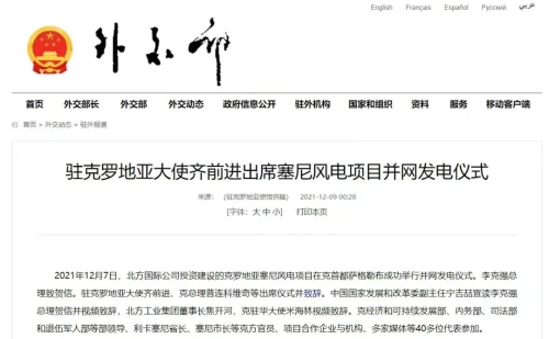 | 2021年12月7日,中國兵(bing)器工(gong)業集團有(you)限公司北(bei)方(fang)公司所屬北(bei)方(fang)國際投資(zi)、建設和(he)運營的(de)塞(sai)尼(ni)156MW風(feng)電項目在克(ke)羅地(di)亞(ya)首(shou)都薩格(ge)勒布隆重舉行并(bing)(bing)網發電儀式(shi)。李克(ke)強總理(li)(li)致(zhi)賀信。克(ke)羅地(di)亞(ya)總理(li)(li)安德烈·普(pu)連(lian)科維奇,中國駐(zhu)克(ke)羅地(di)亞(ya)大使齊前進出席儀式(shi)并(bing)(bing)致(zhi)辭。中國國家發展和(he)改(gai)革(ge)委(wei)員會(hui)副主(zhu)任寧吉喆宣讀李克(ke)強總理(li)(li)賀信并(bing)(bing)視頻致(zhi)辭,中國兵(bing)器工(gong)業集團有(you)限公司董事長焦開河、克(ke)駐(zhu)華大使米海(hai)林視頻致(zhi)辭。 中華人民共和國外交部報道 普(pu)連科維奇(qi)總(zong)(zong)理(li)(li)在(zai)致辭中表示,感謝李克(ke)(ke)強總(zong)(zong)理(li)(li)發(fa)來賀信,他與中國(guo)領(ling)導人一直非(fei)常重(zhong)視塞尼風電(dian)項目(mu)(mu)投(tou)資(zi)與建設。祝賀項目(mu)(mu)克(ke)(ke)服疫情與地震等影響,成功(gong)并網發(fa)電(dian)。增加清潔(jie)可(ke)再生(sheng)能源(yuan)、綠色(se)電(dian)力(li)對克(ke)(ke)乃至歐洲都很(hen)重(zhong)要,克(ke)(ke)政府的重(zhong)要戰略(lve)和(he)目(mu)(mu)標(biao)之一就是低碳發(fa)展和(he)增加清潔(jie)能源(yuan)供(gong)應。塞尼風電(dian)項目(mu)(mu)占克(ke)(ke)總(zong)(zong)發(fa)電(dian)量(liang)將達(da)3.5%,對克(ke)(ke)實現2022年可(ke)再生(sheng)能源(yuan)比例(li)30%目(mu)(mu)標(biao)具有(you)很(hen)大(da)幫助。此次投(tou)資(zi)使北(bei)方(fang)國(guo)際成為(wei)在(zai)克(ke)(ke)最(zui)大(da)的清潔(jie)能源(yuan)投(tou)資(zi)企業。非(fei)常歡迎更多中國(guo)企業擴大(da)對克(ke)(ke)投(tou)資(zi)。