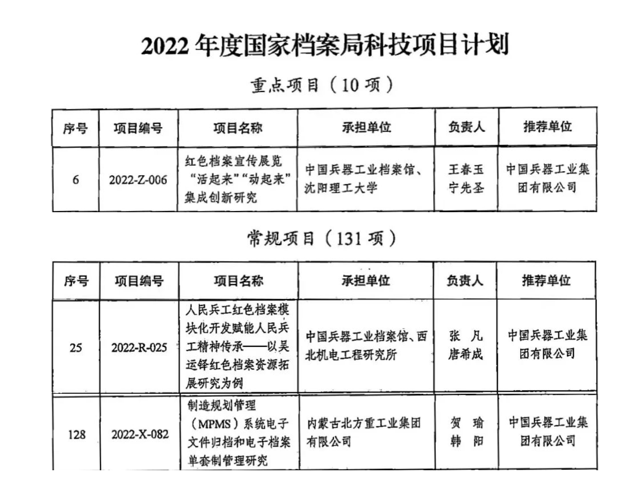 |   為深入貫徹(che)落實(shi)《“十四五(wu)”全國(guo)(guo)檔(dang)(dang)案事業發展(zhan)規劃》要求(qiu),著力提升檔(dang)(dang)案科(ke)(ke)研(yan)自主創新(xin)能力,根據《國(guo)(guo)家(jia)檔(dang)(dang)案局(ju)辦公室(shi)關于開展(zhan)2022年(nian)度(du)國(guo)(guo)家(jia)檔(dang)(dang)案局(ju)科(ke)(ke)技項(xiang)目(mu)立(li)(li)項(xiang)工(gong)(gong)作的通知》要求(qiu),中國(guo)(guo)兵(bing)器(qi)工(gong)(gong)業集團檔(dang)(dang)案館(以(yi)下簡稱檔(dang)(dang)案館)依據《2022年(nian)科(ke)(ke)技項(xiang)目(mu)立(li)(li)項(xiang)選題指南》,組(zu)織各單位申(shen)報成(cheng)功三(san)個(ge)檔(dang)(dang)案科(ke)(ke)技項(xiang)目(mu)在國(guo)(guo)家(jia)檔(dang)(dang)案局(ju)立(li)(li)項(xiang),其中一個(ge)項(xiang)目(mu)為國(guo)(guo)家(jia)級10項(xiang)重(zhong)點(dian)項(xiang)目(mu)之一,排名第六,這是繼2021年(nian)在國(guo)(guo)家(jia)檔(dang)(dang)案局(ju)首次立(li)(li)項(xiang)三(san)個(ge)項(xiang)目(mu)后(hou)的又一重(zhong)大突破,標(biao)志著兵(bing)器(qi)工(gong)(gong)業檔(dang)(dang)案科(ke)(ke)研(yan)工(gong)(gong)作邁上新(xin)臺階。