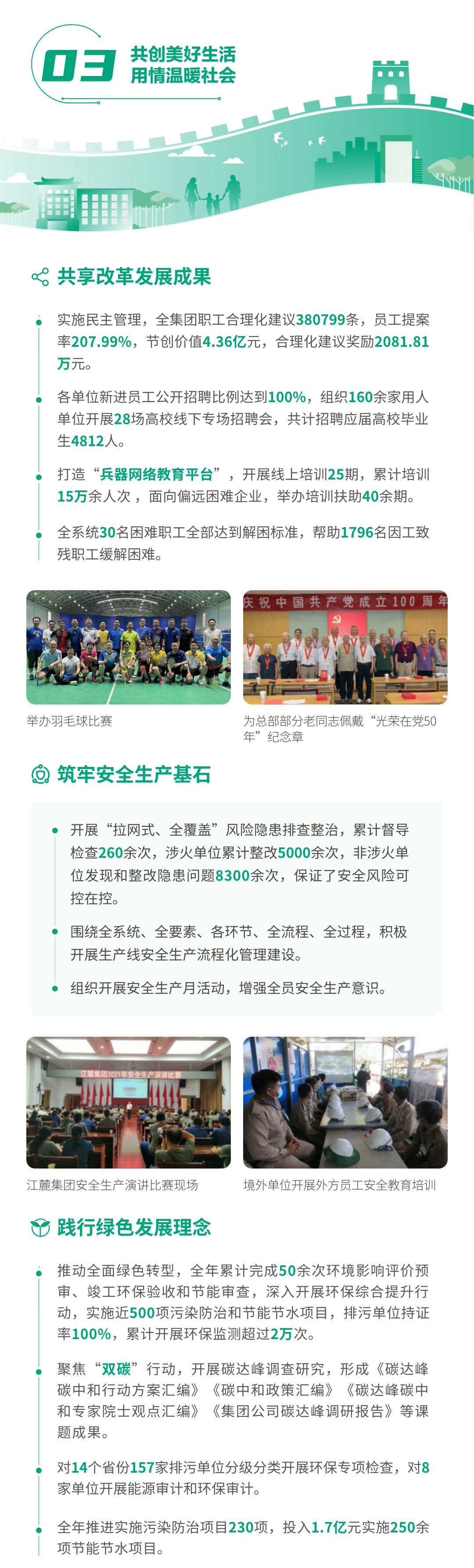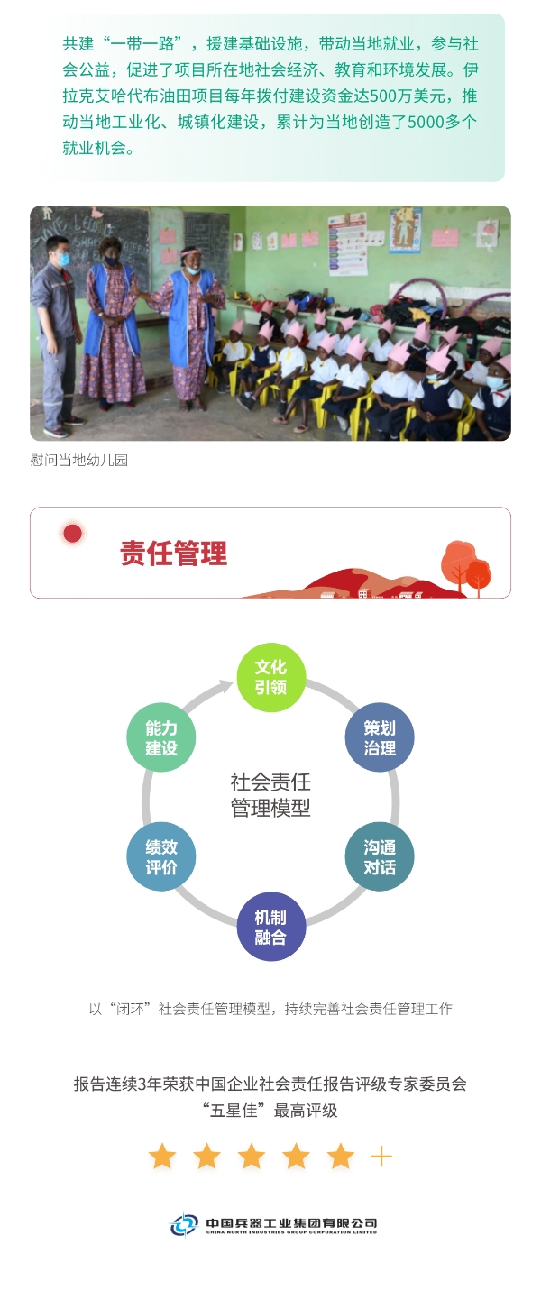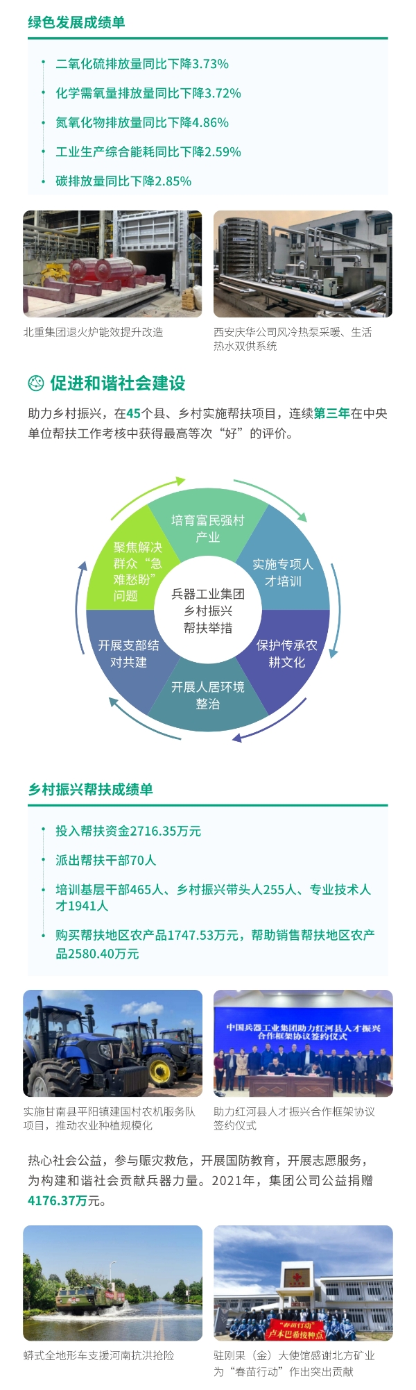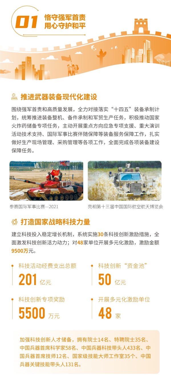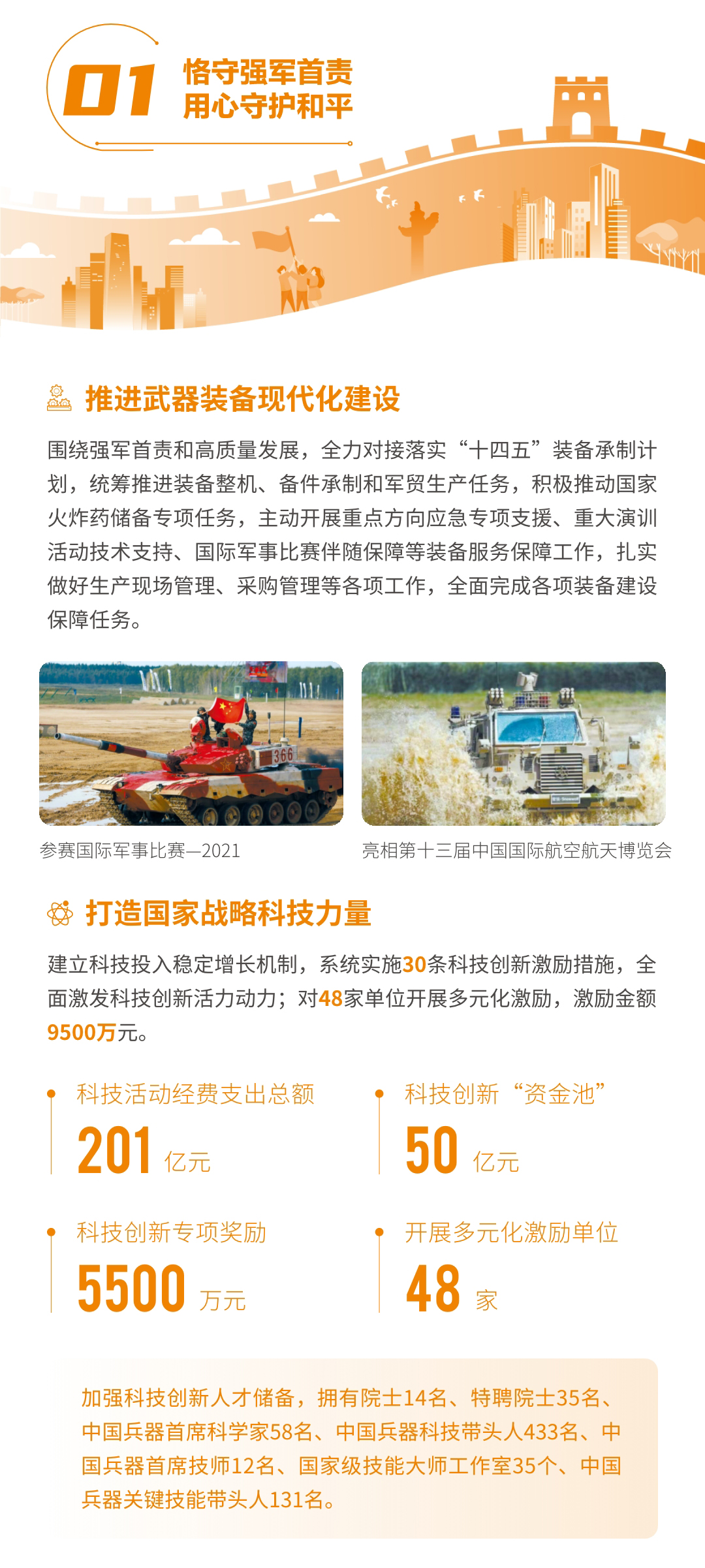 近日,兵器工業集(ji)團正式發布第(di)十三份(fen)年(nian)度社(she)會(hui)(hui)責(ze)任報(bao)(bao)告(gao)(gao)(gao)——《中(zhong)國(guo)兵器工業集(ji)團有限公司2021年(nian)社(she)會(hui)(hui)責(ze)任報(bao)(bao)告(gao)(gao)(gao)》,以“用心守護(hu)和(he)平、用力爭創(chuang)(chuang)一(yi)流、用情(qing)溫暖(nuan)社(she)會(hui)(hui)”為主題,從恪守強軍首責(ze)、服務經濟建設、共創(chuang)(chuang)美好(hao)生活三個維度,向社(she)會(hui)(hui)全面(mian)披露2021年(nian)度履責(ze)實(shi)踐和(he)履責(ze)業績。《報(bao)(bao)告(gao)(gao)(gao)》連續第(di)三年(nian)獲得(de)中(zhong)國(guo)企(qi)業社(she)會(hui)(hui)責(ze)任報(bao)(bao)告(gao)(gao)(gao)評(ping)級專家委(wei)員會(hui)(hui)“五(wu)星佳(jia)”評(ping)級,兵器工業集(ji)團成(cheng)為軍工行業唯一(yi)連續11年(nian)獲得(de)五(wu)星及五(wu)星佳(jia)最高評(ping)級的企(qi)業。 一圖解碼兵器工業的“責任力量”