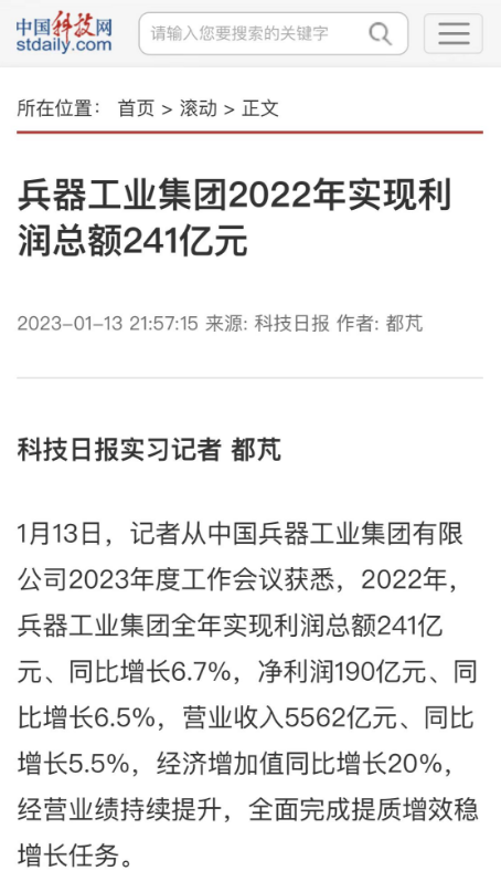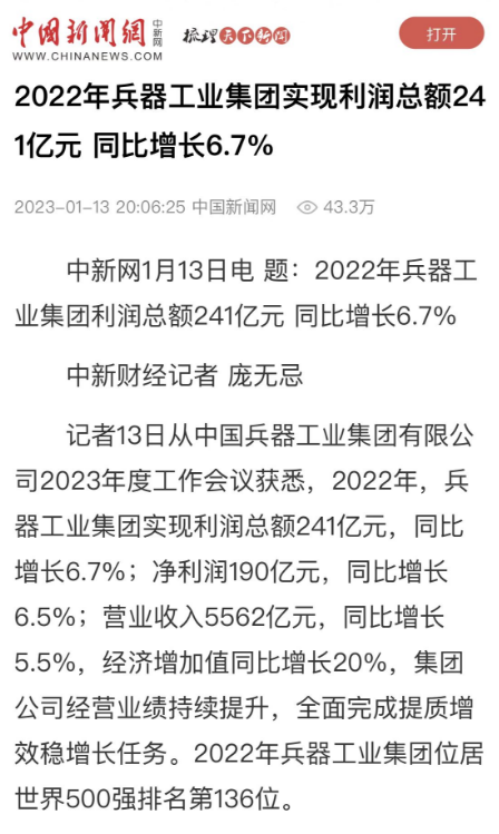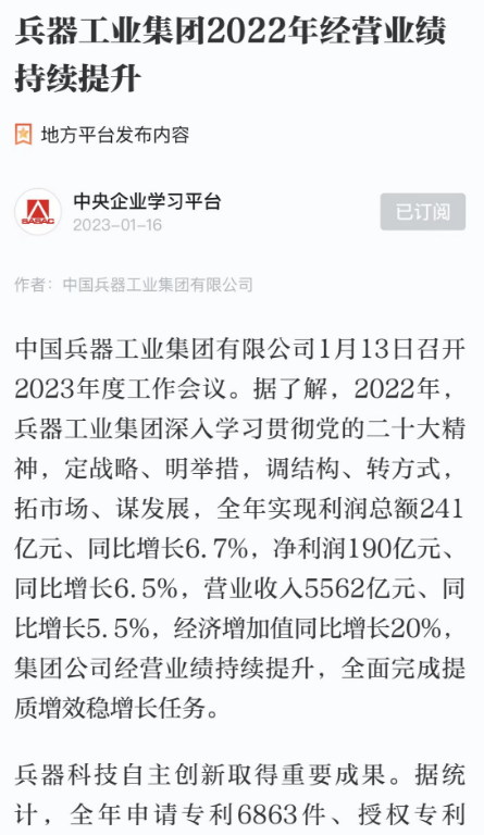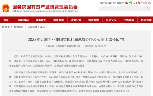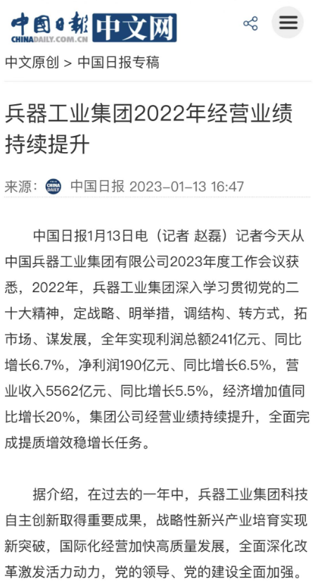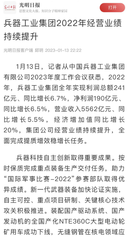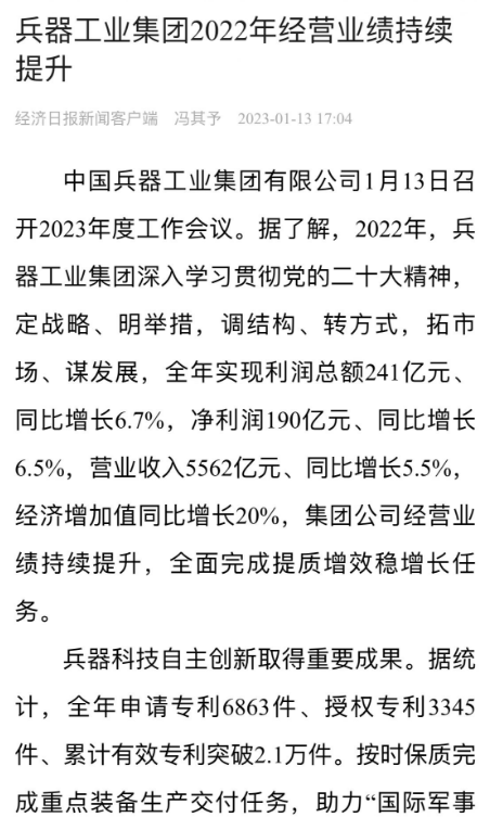 1月13日,中國兵器(qi)工業(ye)集團有限公司(si)(si)召開2023年(nian)度工作會議,傳達學(xue)習中央領導同志、軍(jun)方(fang)首長和(he)上級部(bu)門重要(yao)批示,總(zong)結(jie)集團公司(si)(si)2022年(nian)工作,研究(jiu)部(bu)署2023年(nian)主要(yao)工作任務。 集(ji)(ji)(ji)團(tuan)公司(si)(si)(si)2022年重(zhong)點(dian)(dian)工作取(qu)(qu)得的(de)成(cheng)績及下一步(bu)的(de)改(gai)革發展受(shou)到社會(hui)媒體廣泛(fan)關注(zhu)。新(xin)(xin)(xin)(xin)華社、新(xin)(xin)(xin)(xin)華財經(jing)、人民網(wang)(wang)、經(jing)濟日(ri)(ri)(ri)報(bao)(bao)客戶(hu)端(duan)、光明日(ri)(ri)(ri)報(bao)(bao)客戶(hu)端(duan)、中國日(ri)(ri)(ri)報(bao)(bao)網(wang)(wang)、中國科技網(wang)(wang)、中國新(xin)(xin)(xin)(xin)聞網(wang)(wang)、央廣網(wang)(wang)、國資委網(wang)(wang)站(zhan)、學習(xi)強國中央企(qi)業學習(xi)平(ping)臺(tai)、新(xin)(xin)(xin)(xin)浪網(wang)(wang)、騰(teng)訊網(wang)(wang)、搜狐網(wang)(wang)、網(wang)(wang)易網(wang)(wang)、今日(ri)(ri)(ri)頭(tou)條(tiao)等中央主(zhu)流媒體、國家部委網(wang)(wang)站(zhan)及知名網(wang)(wang)絡媒體對集(ji)(ji)(ji)團(tuan)公司(si)(si)(si)工作會(hui)議進(jin)行(xing)了(le)報(bao)(bao)道,重(zhong)點(dian)(dian)關注(zhu)集(ji)(ji)(ji)團(tuan)公司(si)(si)(si)高(gao)質(zhi)量發展、科技創新(xin)(xin)(xin)(xin)、戰(zhan)略(lve)性(xing)新(xin)(xin)(xin)(xin)興產業培(pei)育、深化(hua)改(gai)革、國際(ji)化(hua)經(jing)營、履行(xing)央企(qi)社會(hui)責任等內容。其中新(xin)(xin)(xin)(xin)華社以《北斗時空智能(neng)服務平(ping)臺(tai)累計服務終端(duan)數突破15億(yi)》為(wei)題,重(zhong)點(dian)(dian)報(bao)(bao)道了(le)集(ji)(ji)(ji)團(tuan)公司(si)(si)(si)2022年在(zai)自主(zhu)創新(xin)(xin)(xin)(xin)、戰(zhan)略(lve)新(xin)(xin)(xin)(xin)興產業培(pei)育、專利申請等方面(mian)取(qu)(qu)得的(de)成(cheng)績;經(jing)濟日(ri)(ri)(ri)報(bao)(bao)客戶(hu)端(duan)、光明日(ri)(ri)(ri)報(bao)(bao)客戶(hu)端(duan)、中國日(ri)(ri)(ri)報(bao)(bao)網(wang)(wang)等以《兵器工業集(ji)(ji)(ji)團(tuan)2022年經(jing)營業績持續(xu)提升(sheng)》為(wei)題,重(zhong)點(dian)(dian)報(bao)(bao)道了(le)集(ji)(ji)(ji)團(tuan)公司(si)(si)(si)在(zai)高(gao)質(zhi)量發展、全面(mian)完成(cheng)提質(zhi)增(zeng)效穩增(zeng)長方面(mian)取(qu)(qu)得的(de)成(cheng)績。集(ji)(ji)(ji)團(tuan)公司(si)(si)(si)門戶(hu)網(wang)(wang)站(zhan)、微信(xin)公眾號、微博等新(xin)(xin)(xin)(xin)媒體也對集(ji)(ji)(ji)團(tuan)公司(si)(si)(si)工作會(hui)議進(jin)行(xing)了(le)及時報(bao)(bao)道,各成(cheng)員單位紛紛對相關內容進(jin)行(xing)轉載,引發全系統關注(zhu)。 新華社:北斗時空智能服務平臺累計服務終端數突破15億 新華財經:兵器工業集團2022年實現凈利潤190億元 同比增長6.5% 人民網:2022年中央企業營收同比增長8.3% 科技創新成效顯著 經濟日報客戶端:兵器工業集團2022年經營業績持續提升 光明日報客戶端:兵器工業集團2022年經營業績持續提升 中國日報網:兵器工業集團2022年經營業績持續提升 中國科技網:兵器工業集團2022年實現利潤總額241億元 中國新聞網:2022年兵器工業集團實現利潤總額241億元 同比增長6.7% 國資委網站:2022年兵器工業集團實現利潤總額241億元 同比增長6.7% 學習強國中央企業學習平臺:兵器工業集團2022年經營業績持續提升 集團公司職工及廣大網友熱議工作會議 “這(zhe)次會議(yi)全(quan)面(mian)總結了2022年工(gong)作(zuo),深入分析研判當前形勢,部署(shu)2023年重(zhong)點工(gong)作(zuo),為我(wo)們做(zuo)好(hao)2023年及(ji)今后(hou)一個(ge)時(shi)期的(de)工(gong)作(zuo)明確(que)了目標、堅定了信心(xin)。” “作(zuo)為兵工人(ren),我要苦(ku)練內功、不懼挑戰、奮勇向前(qian),為建設具有全球競(jing)爭(zheng)力的(de)(de)世界(jie)一流集團公(gong)司(si)貢獻自己的(de)(de)力量。” “聚焦(jiao)高科技領域,制造更多的大國重器(qi),讓更多的產品服務老百姓。” “在(zai)不平凡的(de)2022年取得了(le)亮眼(yan)的(de)工作成績,為(wei)兵器工業點贊。” “希望能有更(geng)多新型(xing)武器(qi)裝備部隊,2023年,望你們再(zai)創輝煌(huang),加油!” |
