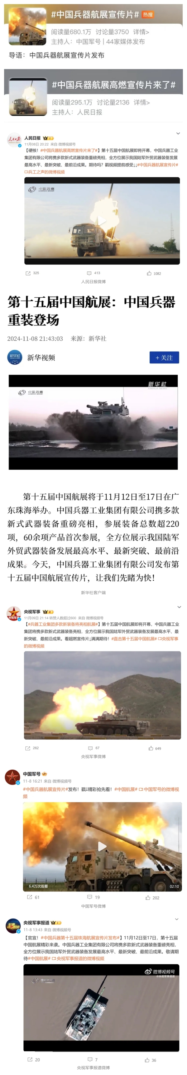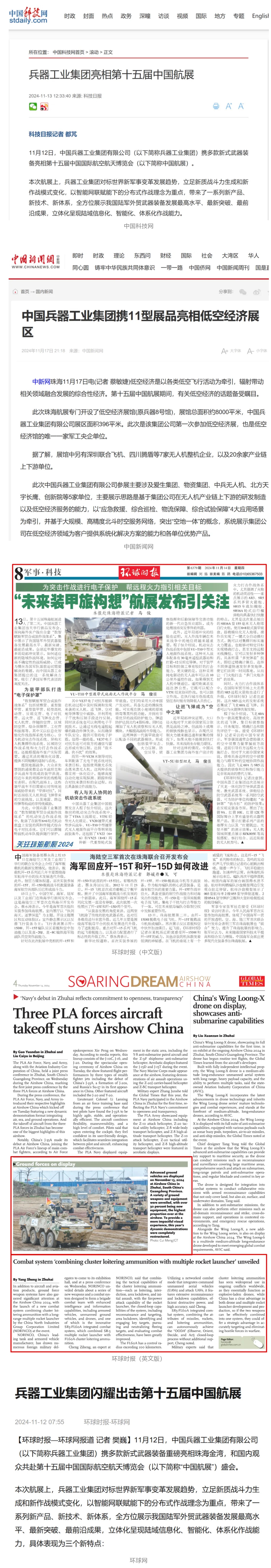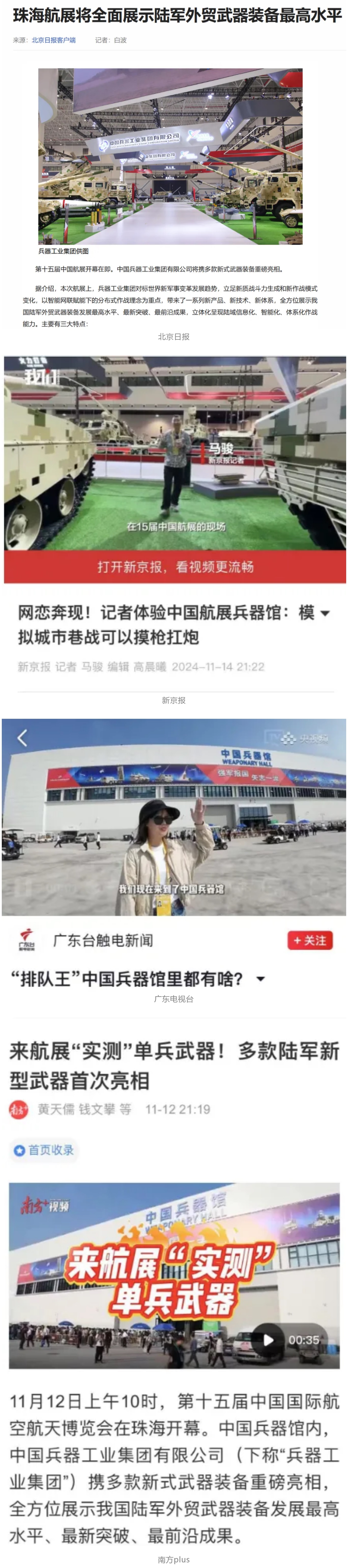 11月(yue)(yue)13日(ri)央(yang)(yang)(yang)視(shi)(shi)新(xin)(xin)聞(wen)(wen)(wen)《藍(lan)天(tian)(tian)之約》直播(bo)地面裝備(bei)動態演示此(ci)次(ci)航展,央(yang)(yang)(yang)視(shi)(shi)綜(zong)合(he)頻(pin)(pin)(pin)(pin)道(dao)(dao)《新(xin)(xin)聞(wen)(wen)(wen)聯播(bo)》《晚間(jian)(jian)新(xin)(xin)聞(wen)(wen)(wen)》、新(xin)(xin)聞(wen)(wen)(wen)頻(pin)(pin)(pin)(pin)道(dao)(dao)《新(xin)(xin)聞(wen)(wen)(wen)直播(bo)間(jian)(jian)》《新(xin)(xin)聞(wen)(wen)(wen)30分(fen)》《朝聞(wen)(wen)(wen)天(tian)(tian)下》《共同關注》《東方時(shi)空》《午(wu)夜(ye)新(xin)(xin)聞(wen)(wen)(wen)》、財經頻(pin)(pin)(pin)(pin)道(dao)(dao)《天(tian)(tian)下財經》《經濟信息聯播(bo)》《正(zheng)(zheng)(zheng)點財經》《第一時(shi)間(jian)(jian)》、中(zhong)文國(guo)(guo)(guo)際頻(pin)(pin)(pin)(pin)道(dao)(dao)《今日(ri)環(huan)球》《中(zhong)國(guo)(guo)(guo)新(xin)(xin)聞(wen)(wen)(wen)》、國(guo)(guo)(guo)防(fang)軍(jun)事(shi)頻(pin)(pin)(pin)(pin)道(dao)(dao)《軍(jun)事(shi)報(bao)(bao)道(dao)(dao)》《正(zheng)(zheng)(zheng)午(wu)國(guo)(guo)(guo)防(fang)軍(jun)事(shi)》《國(guo)(guo)(guo)防(fang)軍(jun)事(shi)早報(bao)(bao)》《軍(jun)迷行天(tian)(tian)下》等欄目共播(bo)出兵器(qi)工業集團參展相(xiang)關新(xin)(xin)聞(wen)(wen)(wen)報(bao)(bao)道(dao)(dao)40余條(tiao)。11月(yue)(yue)10日(ri)央(yang)(yang)(yang)視(shi)(shi)新(xin)(xin)聞(wen)(wen)(wen)頻(pin)(pin)(pin)(pin)道(dao)(dao)《新(xin)(xin)聞(wen)(wen)(wen)30分(fen)》11月(yue)(yue)10日(ri)央(yang)(yang)(yang)視(shi)(shi)中(zhong)文國(guo)(guo)(guo)際頻(pin)(pin)(pin)(pin)道(dao)(dao)《中(zhong)國(guo)(guo)(guo)新(xin)(xin)聞(wen)(wen)(wen)》11月(yue)(yue)10日(ri)央(yang)(yang)(yang)視(shi)(shi)國(guo)(guo)(guo)防(fang)軍(jun)事(shi)頻(pin)(pin)(pin)(pin)道(dao)(dao)《軍(jun)事(shi)報(bao)(bao)道(dao)(dao)》11月(yue)(yue)11日(ri)央(yang)(yang)(yang)視(shi)(shi)國(guo)(guo)(guo)防(fang)軍(jun)事(shi)頻(pin)(pin)(pin)(pin)道(dao)(dao)《正(zheng)(zheng)(zheng)午(wu)國(guo)(guo)(guo)防(fang)軍(jun)事(shi)》