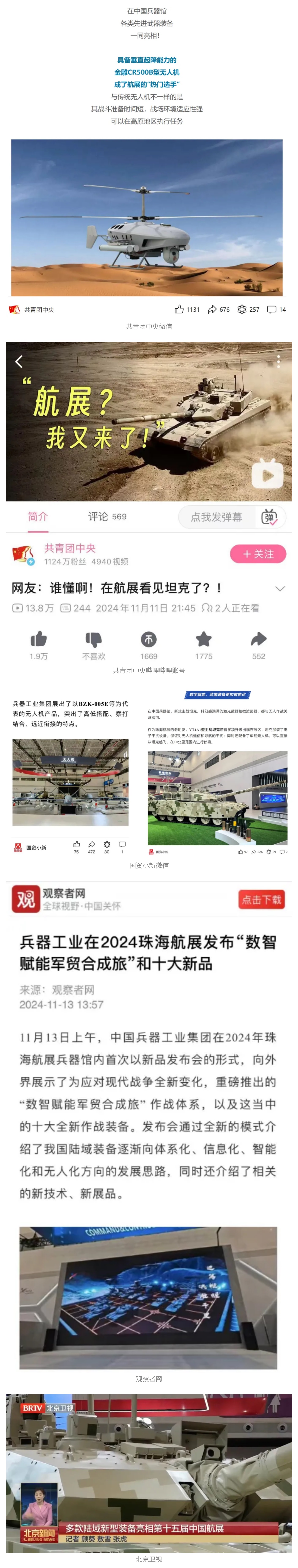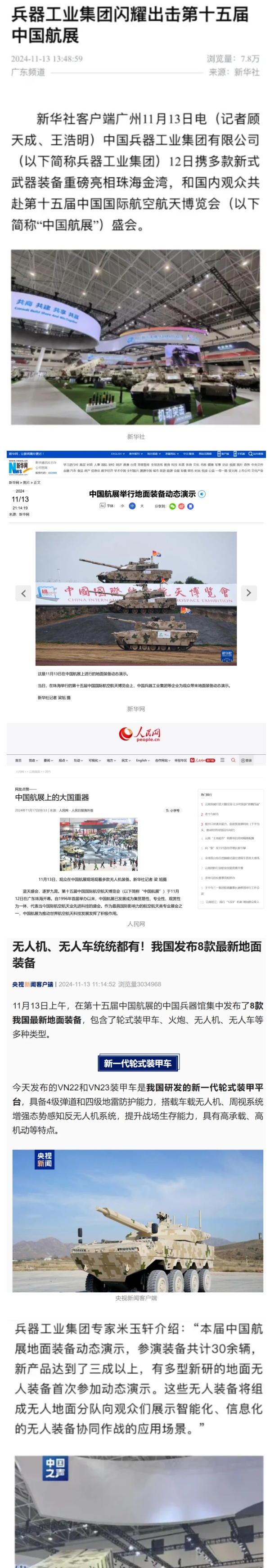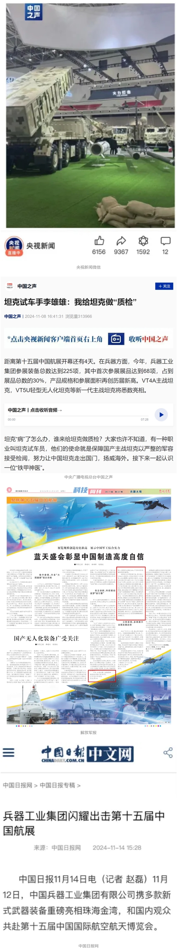 11月12日至17日,第十五(wu)屆中國國際(ji)航(hang)空航(hang)天博覽會在(zai)廣東省珠海市(shi)舉行,中國兵(bing)器(qi)工(gong)業集(ji)(ji)團(tuan)有限公司突(tu)出(chu)數智(zhi)賦能軍貿合成旅作(zuo)(zuo)戰體(ti)系(xi)(xi),帶來了(le)一(yi)系(xi)(xi)列新(xin)(xin)產品、新(xin)(xin)技術、新(xin)(xin)體(ti)系(xi)(xi),全方位展(zhan)(zhan)示我國陸(lu)軍外貿武器(qi)裝(zhuang)備發展(zhan)(zhan)最高水平、最新(xin)(xin)突(tu)破、最前沿成果,立體(ti)化(hua)(hua)呈現陸(lu)域(yu)(yu)信息(xi)化(hua)(hua)、智(zhi)能化(hua)(hua)、體(ti)系(xi)(xi)化(hua)(hua)作(zuo)(zuo)戰能力,受到了(le)全社會廣泛關注。航(hang)展(zhan)(zhan)期間(jian),央視(shi)綜合頻(pin)道(dao)《新(xin)(xin)聞(wen)聯(lian)播》、央視(shi)新(xin)(xin)聞(wen)頻(pin)道(dao)《新(xin)(xin)聞(wen)直(zhi)(zhi)播間(jian)》《長空鵬(peng)程(cheng)》報道(dao)兵(bing)器(qi)工(gong)業集(ji)(ji)團(tuan)參展(zhan)(zhan)情況(kuang),重點介(jie)紹了(le)VT4A1主戰坦克(ke)、輪(lun)式裝(zhuang)甲火(huo)炮、新(xin)(xin)一(yi)代(dai)陸(lu)域(yu)(yu)指控信息(xi)系(xi)(xi)統、無(wu)人(ren)戰車(che)、民(min)用(yong)無(wu)人(ren)運輸機及地面裝(zhuang)備演示有關內容。央視(shi)新(xin)(xin)聞(wen)推出(chu)航(hang)展(zhan)(zhan)直(zhi)(zhi)播節目《藍天之約》,邀請兵(bing)器(qi)工(gong)業集(ji)(ji)團(tuan)嘉賓(bin)對參展(zhan)(zhan)情況(kuang)、裝(zhuang)備動態演示作(zuo)(zuo)了(le)講解。
