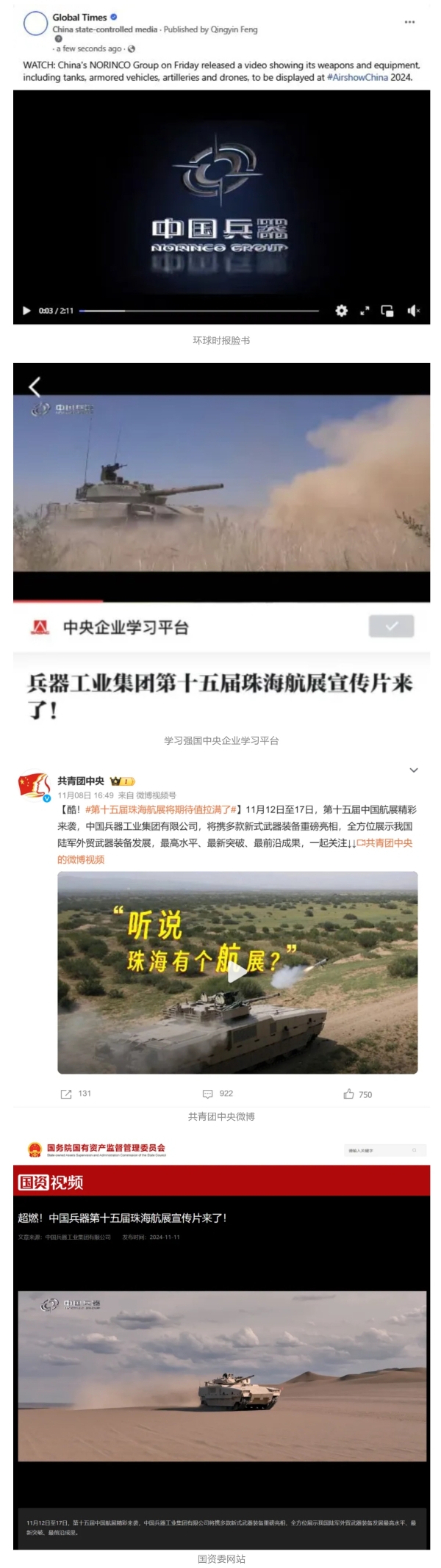 人(ren)民日(ri)報(bao)微(wei)(wei)(wei)(wei)博(bo)(bo)(bo)、新(xin)華社客戶端(duan)、央(yang)視軍事微(wei)(wei)(wei)(wei)博(bo)(bo)(bo)、中(zhong)(zhong)國(guo)軍號微(wei)(wei)(wei)(wei)博(bo)(bo)(bo)、央(yang)視軍事報(bao)道微(wei)(wei)(wei)(wei)博(bo)(bo)(bo)、中(zhong)(zhong)國(guo)日(ri)報(bao)微(wei)(wei)(wei)(wei)博(bo)(bo)(bo)、中(zhong)(zhong)國(guo)新(xin)聞網、中(zhong)(zhong)國(guo)青(qing)年報(bao)-青(qing)蜂俠、環(huan)球網、環(huan)球時(shi)報(bao)(臉書、X平臺(tai))、學(xue)習(xi)強國(guo)中(zhong)(zhong)央(yang)企(qi)業學(xue)習(xi)平臺(tai)、共青(qing)團中(zhong)(zhong)央(yang)微(wei)(wei)(wei)(wei)博(bo)(bo)(bo)、國(guo)資(zi)委(wei)(wei)網站等20余家(jia)(jia)中(zhong)(zhong)央(yang)主(zhu)流(liu)媒體(ti)、國(guo)家(jia)(jia)部(bu)委(wei)(wei)的新(xin)媒體(ti)第一時(shi)間播發集團公(gong)(gong)司航展宣傳片等視頻作品燃(ran)爆全網,累計閱讀量突破1200萬人(ren)次。集團公(gong)(gong)司微(wei)(wei)(wei)(wei)信(xin)公(gong)(gong)眾號、微(wei)(wei)(wei)(wei)博(bo)(bo)(bo)、抖(dou)音號、快手(shou)號、微(wei)(wei)(wei)(wei)信(xin)視頻號、知乎號等新(xin)媒體(ti)宣傳片播放閱讀量近(jin)1000萬人(ren)次,點贊近(jin)20萬人(ren)次。