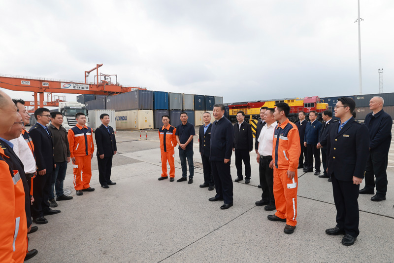 4月22日至24日,中(zhong)共中(zhong)央總書記、國家主(zhu)席(xi)(xi)、中(zhong)央軍委(wei)主(zhu)席(xi)(xi)習(xi)近(jin)平在(zai)重慶(qing)考察。這是22日下午,習(xi)近(jin)平在(zai)重慶(qing)國際物流樞(shu)紐園區重慶(qing)鐵路集裝箱中(zhong)心(xin)站(zhan),同貨車司(si)機、列車司(si)機、裝卸工人(ren)、場站(zhan)管理人(ren)員(yuan)等親切交(jiao)流。