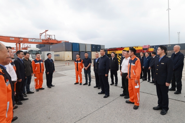 4月22日(ri)至(zhi)24日(ri),中(zhong)共(gong)中(zhong)央(yang)總書記、國家主(zhu)(zhu)席、中(zhong)央(yang)軍委(wei)主(zhu)(zhu)席習(xi)近(jin)平(ping)在重(zhong)慶考察。這(zhe)是(shi)22日(ri)下午(wu),習(xi)近(jin)平(ping)在重(zhong)慶國際物(wu)流樞紐園區(qu)重(zhong)慶鐵路集裝箱中(zhong)心站,同貨車司機、列車司機、裝卸工人(ren)、場站管理人(ren)員等(deng)親切交流。