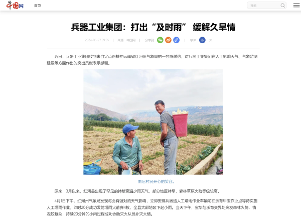 5月27日,中(zhong)國(guo)網刊發《兵器(qi)工(gong)業集團(tuan):打出(chu)“及時(shi)雨” 緩解久旱情(qing)》,對中(zhong)國(guo)兵器(qi)工(gong)業集團(tuan)有限公司助(zhu)力云南省紅河(he)州(zhou)人工(gong)影響天(tian)氣、氣象監測建設等(deng)方面作出(chu)的突出(chu)貢(gong)獻(xian)作了(le)報道。 兵器工業集團:打出“及時雨” 緩解久旱情 近日,兵器(qi)工業(ye)集團收到來自(zi)定點幫(bang)扶的(de)云南(nan)省紅河州(zhou)氣象局的(de)一封感謝信,對兵器(qi)工業(ye)集團在人(ren)工影響天氣、氣象監(jian)測建(jian)設等方(fang)面作(zuo)出(chu)的(de)突出(chu)貢獻表示感謝。 原來,3月以(yi)來,紅(hong)河縣出(chu)現(xian)了罕見的持續高(gao)溫少雨(yu)天氣,部分地區特旱(han),森(sen)林草原火險(xian)等(deng)級較高(gao)。 4月1日(ri)下午,紅河州氣(qi)象局(ju)發(fa)現將會(hui)有強對流天氣(qi)影響,立即安(an)排兵(bing)器造人(ren)工增(zeng)雨(yu)(yu)作業車輛前往樂育甲寶(bao)作業點等待實施人(ren)工增(zeng)雨(yu)(yu)作業,21時(shi)20分(fen)(fen)成功發(fa)射增(zeng)雨(yu)(yu)火(huo)(huo)箭彈(dan)4枚,全縣大部地區(qu)下起(qi)小(xiao)雨(yu)(yu)。當(dang)天下午,寶(bao)華與樂育交界處突發(fa)森林火(huo)(huo)情(qing),情(qing)況(kuang)較復(fu)雜(za),持(chi)續20分(fen)(fen)鐘(zhong)的小(xiao)雨(yu)(yu)過程成功協助(zhu)滅火(huo)(huo)隊員(yuan)撲滅火(huo)(huo)情(qing)。